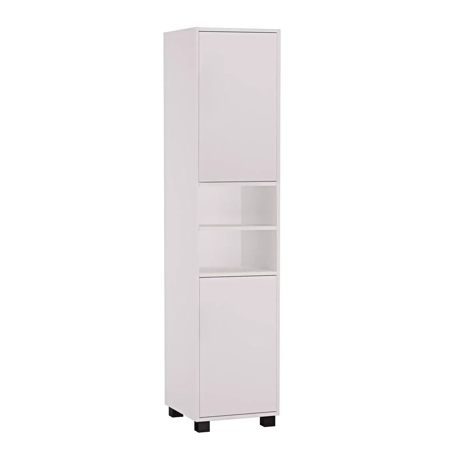 Biały – ponadczasowa klasyka, która rozjaśni każde pomieszczenie. Antracyt – nowoczesny, głęboki kolor dodający elegancji. Dąb złoty – ciepły, naturalny odcień drewna wprowadzający przytulność. Dąb Sonoma – uniwersalny odcień łączący nowoczesność z naturą. Funkcjonalne wnętrze – szafka wyposażona jest w dwie pary drzwiczek (górne i dolne) oraz dwie otwarte półki, oferując łącznie sześć pojemnych półek do przechowywania kosmetyków, ręczników i innych akcesoriów.