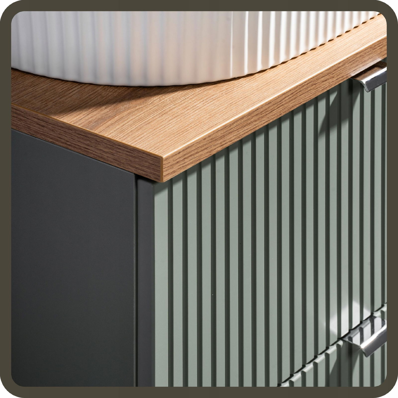 Meble łazienkowe LINE REED GREEN to wyjątkowy hołd dla indywidualności, który łączy w sobie klasę i harmonię. Jej sercem jest delikatny, ale odważny odcień szałwii, który nie tylko przyciąga uwagę, ale także nadaje wnętrzu niepowtarzalny charakter, tworząc jednocześnie atmosferę spokoju i relaksu. Subtelne pionowe ryflowania na frontach mebli dodają im elegancji, podkreślając ich unikalność.