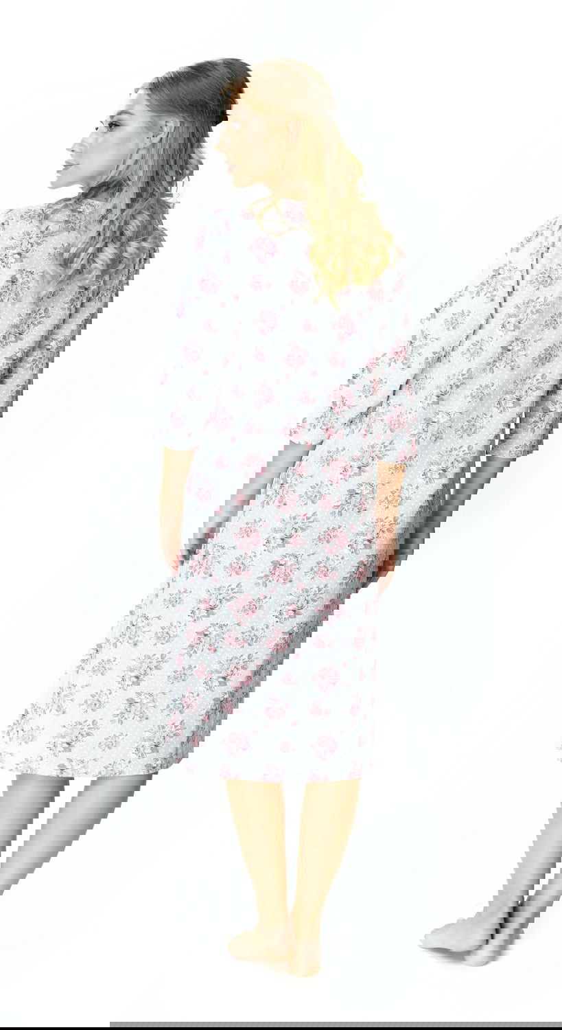 Koszula nocna Ingrid ma piękny kwiecisty wzór, klasyczny, lekko rozkloszowany krój z rękawami o długości ¾. Ingrid ma prosty dekolt odsłaniający szyję i podkreślający obojczyki oraz ozdobny szew nad biustem. Piękne różowe guziczki pozwalają na rozpięcie górnej części koszuli, dodając jej uroku i czyniąc ją jeszcze bardziej praktyczną.