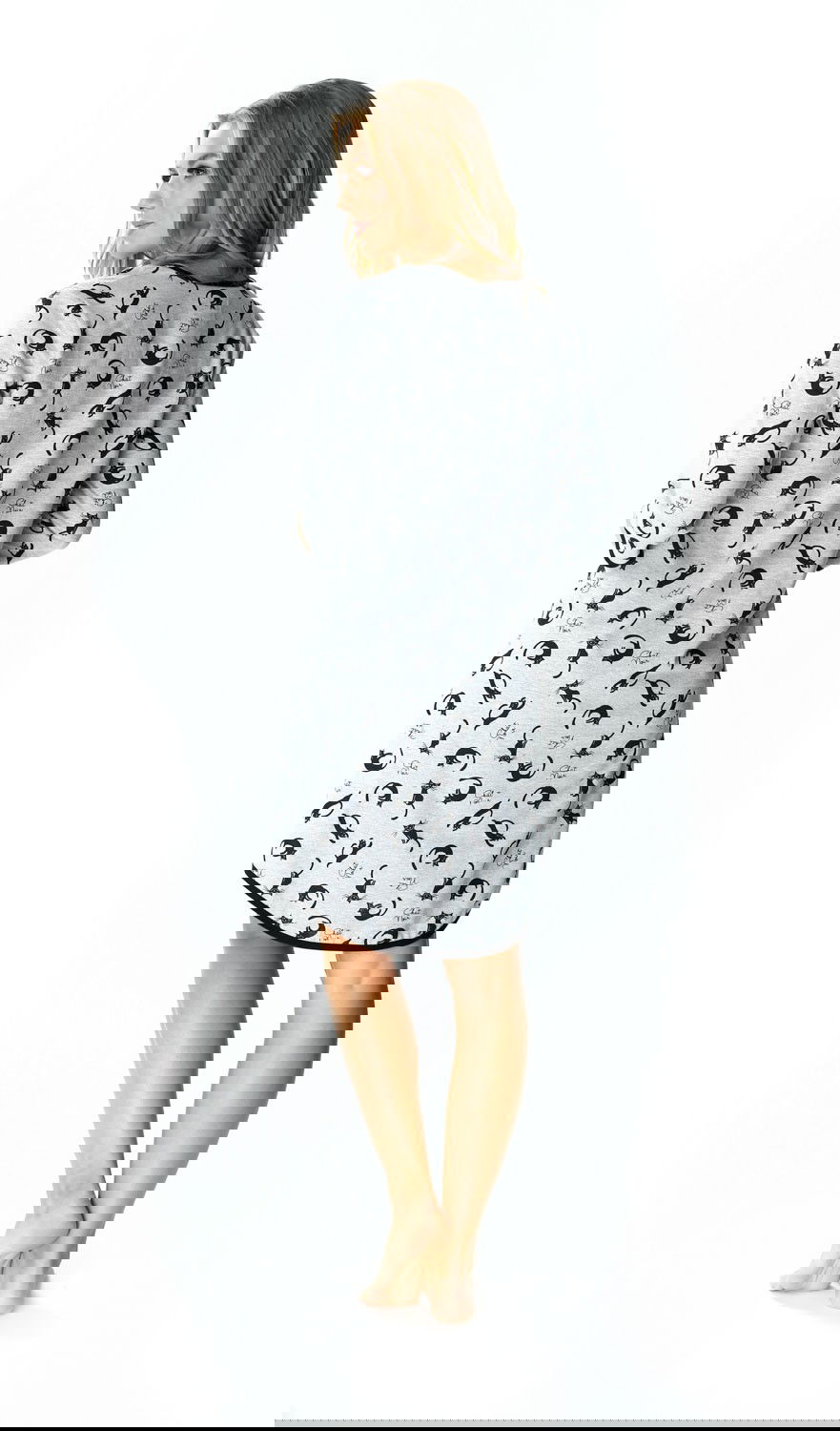 Koszula bawełniana wzór Kitty to propozycja dla miłośniczek kotów w każdym wieku. Koszula została wykonana z bawełny w kolorze szarym. Koszula Kitty posiada rękawy o długości 3/4, które są bardzo wygodne i praktyczne. Koszula posiada wzór przedstawiający koty, a dodatkowego uroku dodaje jej czarna lamówka, którą wykończony jest dekolt oraz rękawy.