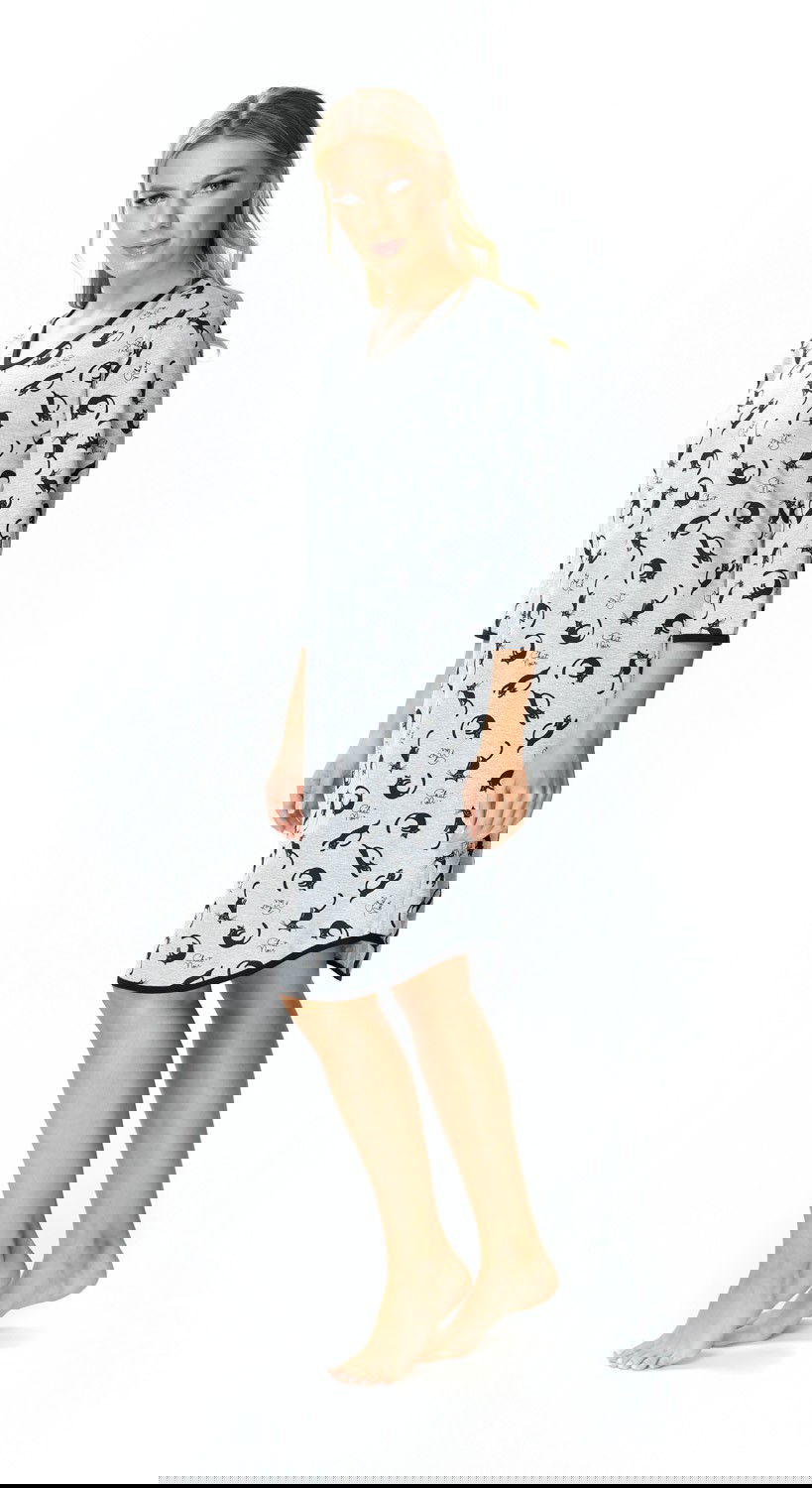 Koszula bawełniana wzór Kitty to propozycja dla miłośniczek kotów w każdym wieku. Koszula została wykonana z bawełny w kolorze szarym. Koszula Kitty posiada rękawy o długości 3/4, które są bardzo wygodne i praktyczne. Koszula posiada wzór przedstawiający koty, a dodatkowego uroku dodaje jej czarna lamówka, którą wykończony jest dekolt oraz rękawy.