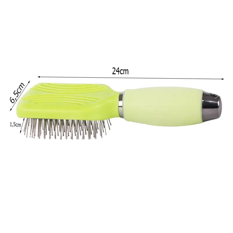 Szczotka posiada igły na końcu zakończone kulką aby podczas czesania nie ranić pupila i aby wyczesywanie było dla niego przyjemnością. Rączka została wykonana z gumy i nie wyślizguje się z dłoni.