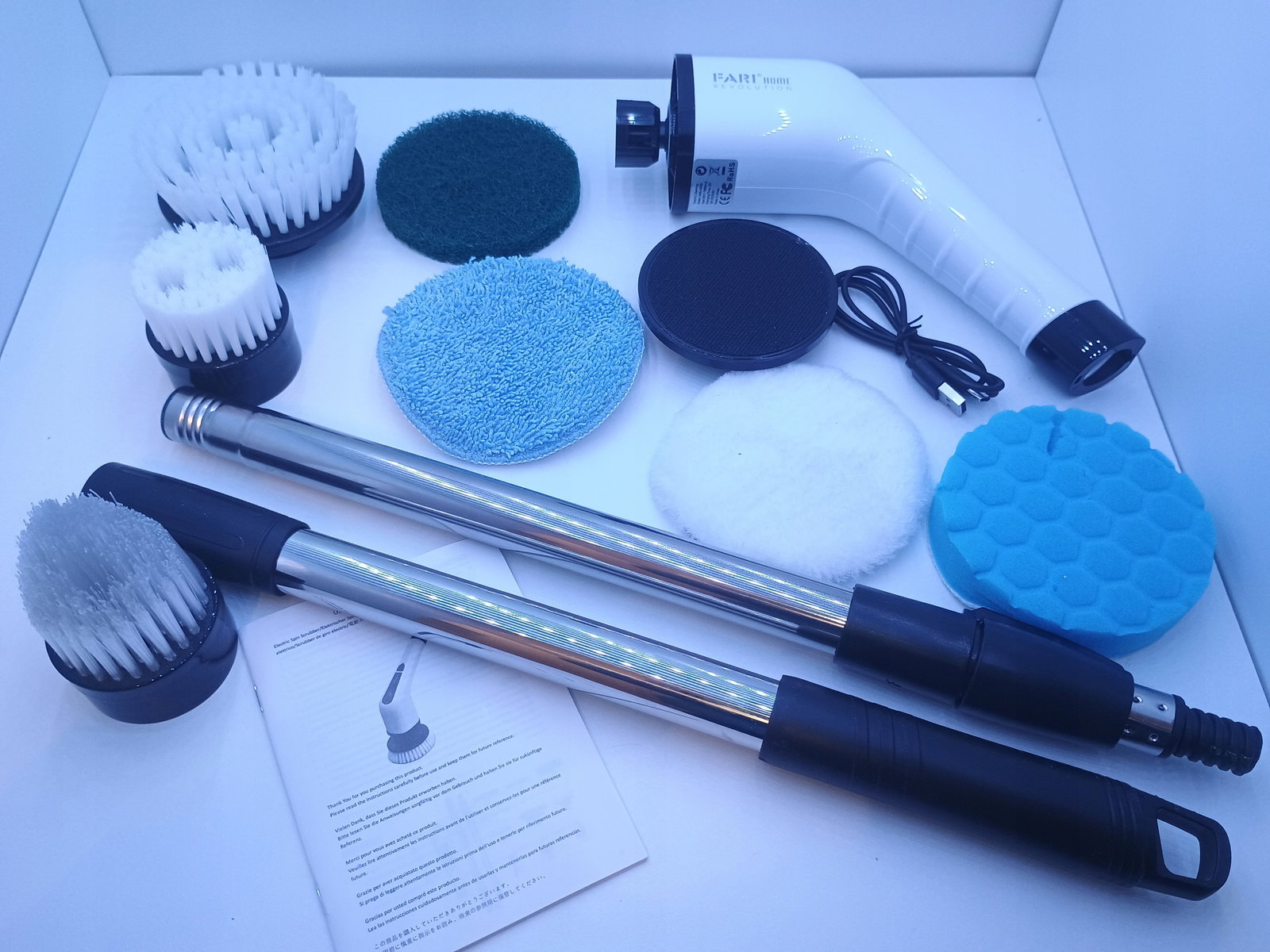 [Wielofunkcyjny środek czyszczący]- Zawiera 7 obrotowych głowic szorujących, odpowiednich do czyszczenia łazienki, wanny, prysznica, blatu, kuchenki, zlewu, szkła, ławki kuchennej, płytek, wanny i tak dalej.
