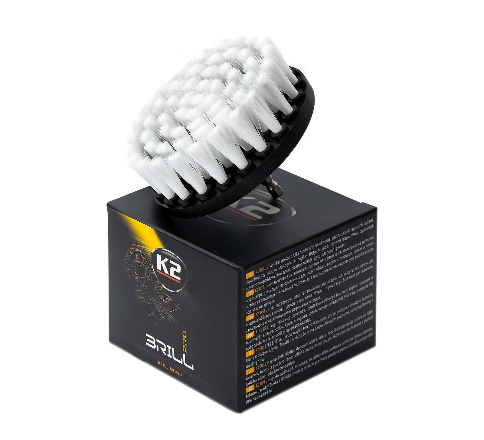 Szczotka na wiertarkę K2 Brill to profesjonalna, wysokiej jakości szczotka do czyszczenia tapicerki. Może być montowana na wiertarce lub wkrętarce, bez użycia dodatkowej przejściówki. Pozwala na szybkie i proste oczyszczenie mocno zabrudzonych powierzchni, przy minimalnym trudzie ze strony użytkownika. Wyposażona jest w miękkie, elastyczne, syntetyczne włosie zapewniające bezpieczeństwo czyszczonych powierzchni. Podstawa z tworzywa sztucznego niweluje ryzyko wykrzywień i pęknięć. Specjalnie dobrana struktura włosia zapewnia całkowite bezpieczeństwo dla czyszczonego materiału, nie wpływa negatywnie na nawet najbardziej delikatne sploty tkaniny. Nie powoduje mechacenia. Szczotka K2 Brill wykonana jest z najwyższej jakości materiałów. Posiada dużą odporność na działanie środków chemicznych, co znacząco wpływa na wydłużenie jej żywotności. Podstaw z tworzywa eliminuje problem pękania na skutek przemoczenia szczotki, występujący w konstrukcjach z drewnianą podstawą. Może być używana na mokro lub sucho, idealnie nadaje się np. do usunięcia piasku z tapicerki. Świetnie sprawdza się również przy czyszczeniu tworzyw sztucznych.