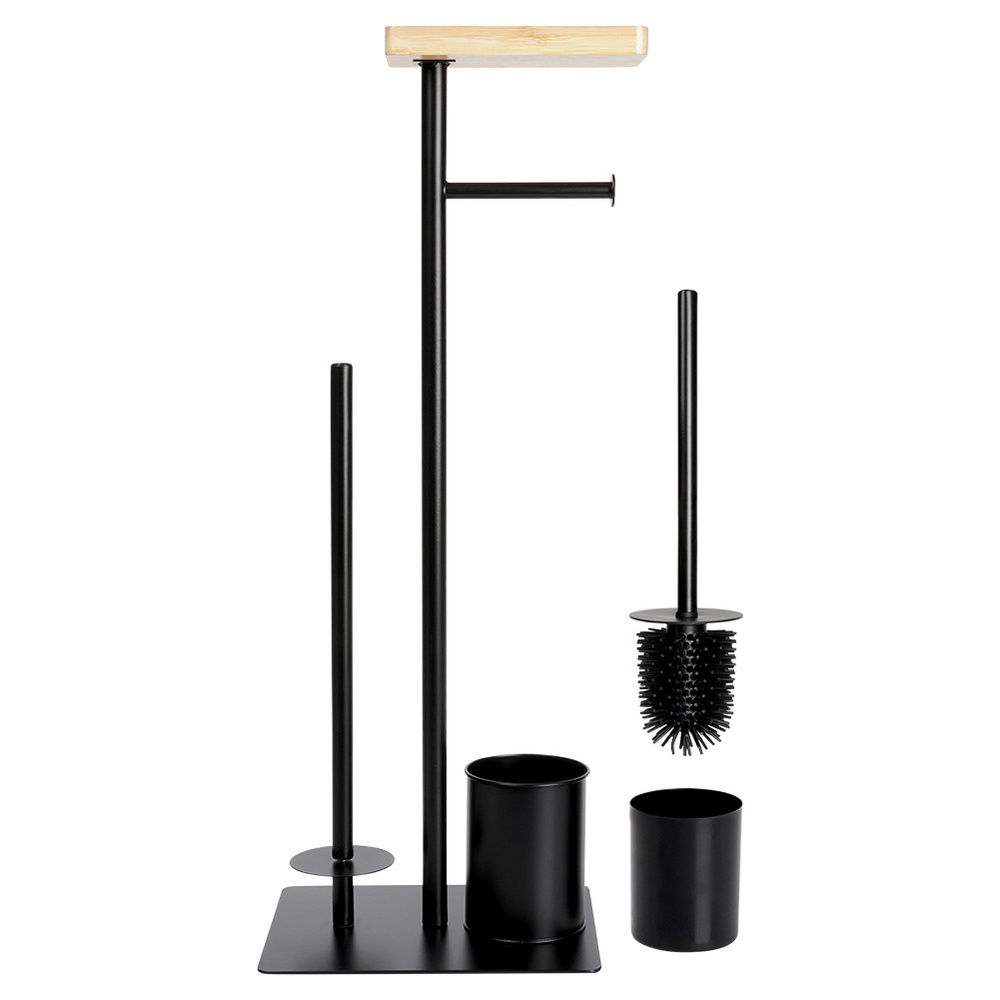 Stojak na papier toaletowy ze szczotką - Wielofunkcyjny stojak łazienkowy z uchwytem na papier toaletowy, miejscem na trzy zapasowe rolki, pojemnikiem ze szczotką WC oraz miejscem do odłożenia telefonu. Stojak ma wymiary: 25 x 20 x 68,5 cm.