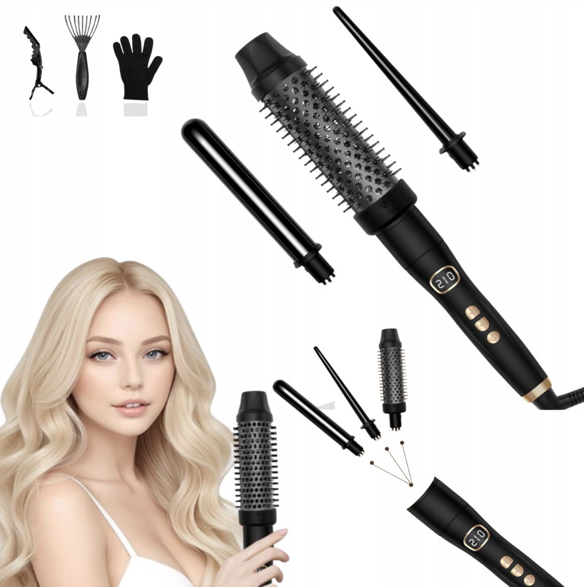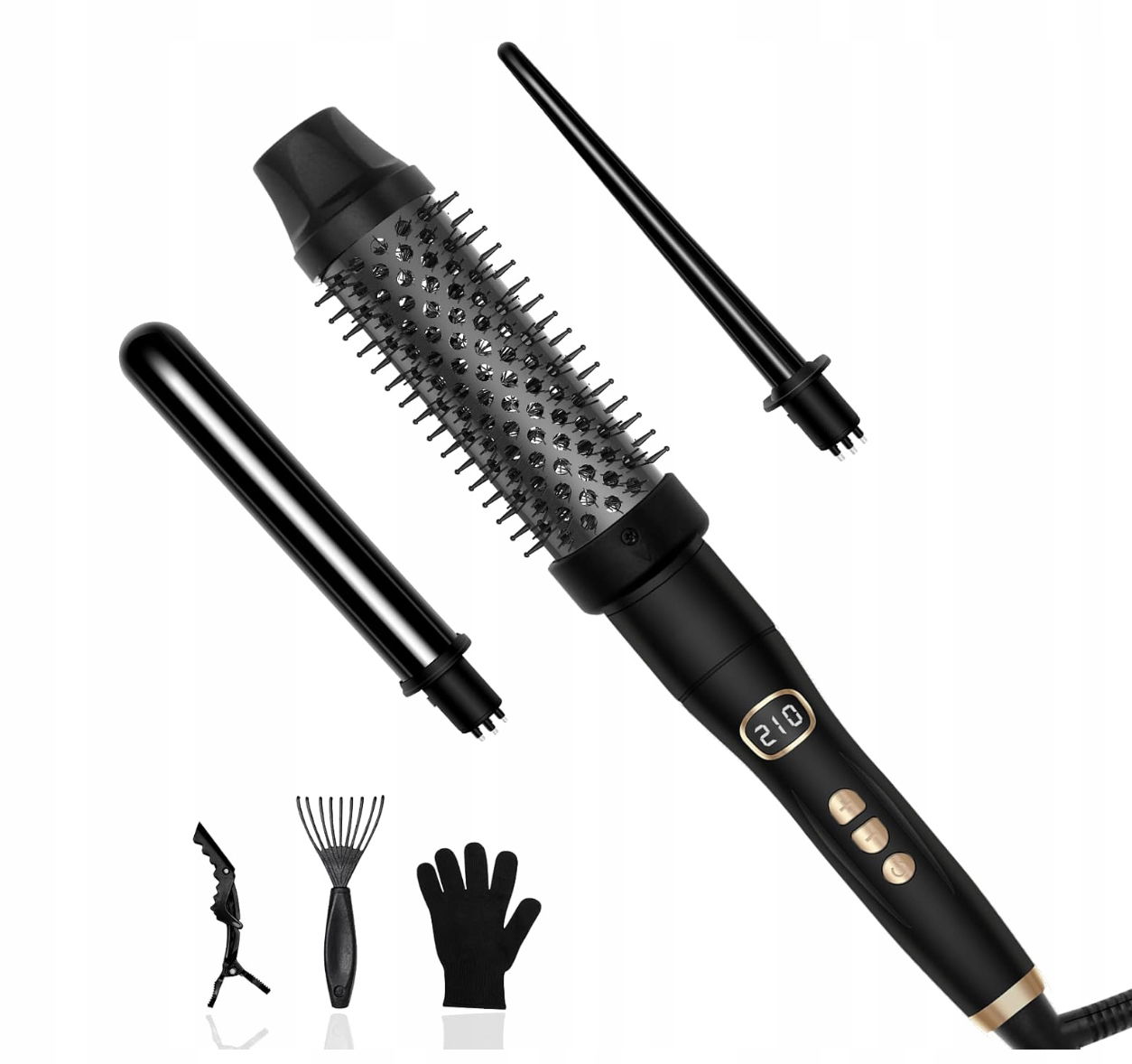 ✅ 3 końcówki w zestawie – stożkowa lokówka (9 mm), lokówka klasyczna (19 mm) oraz szczotka termiczna (28 mm) dają nieograniczone możliwości stylizacji.