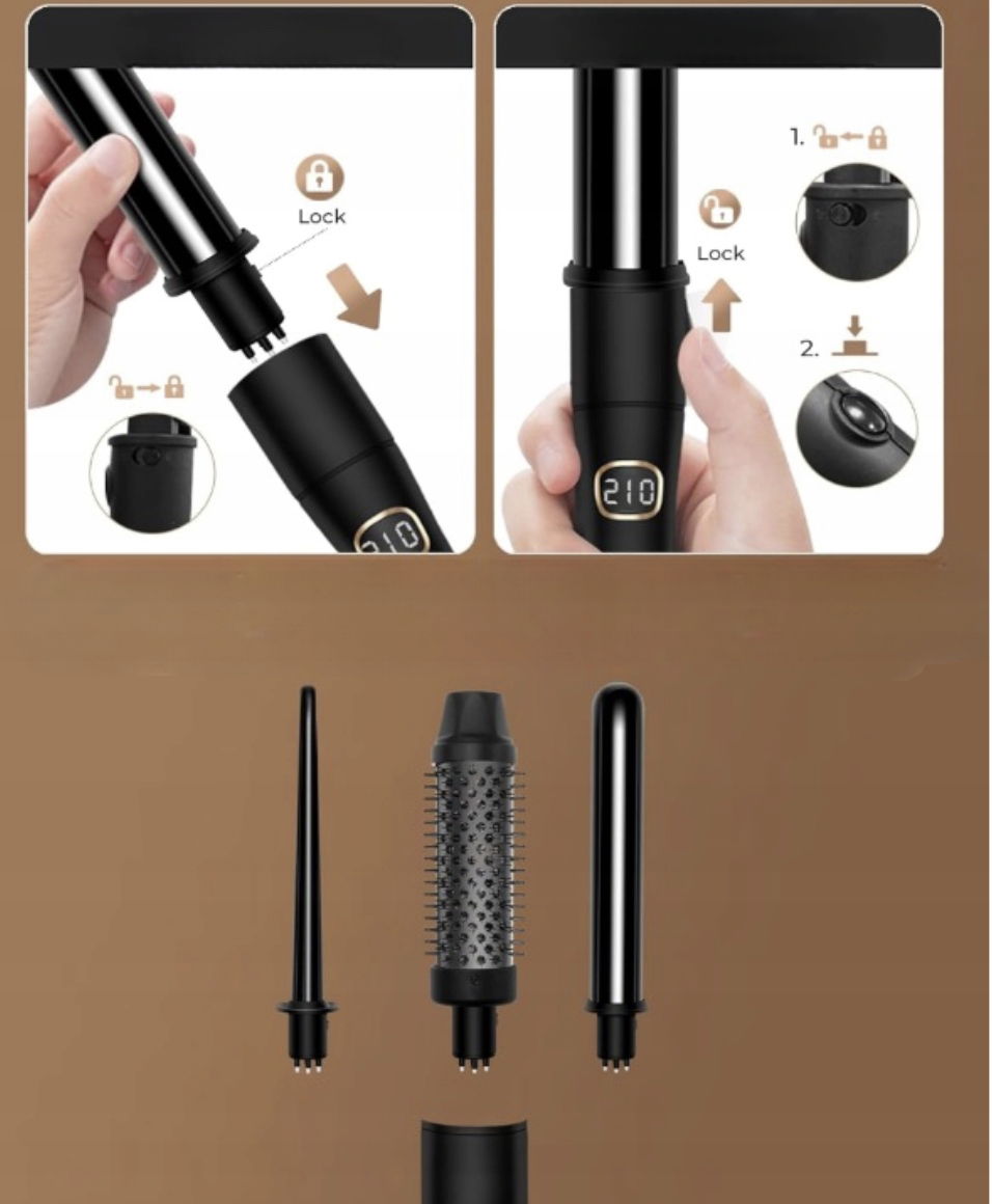 Dzięki wymiennym końcówkom i ceramicznej technologii jonowej, możesz tworzyć małe sprężyste loki, miękkie fale lub gładkie pasma z naturalnym połyskiem – wszystko w jednym, eleganckim urządzeniu. To idealne rozwiązanie zarówno do codziennej stylizacji, jak i na wyjątkowe okazje.