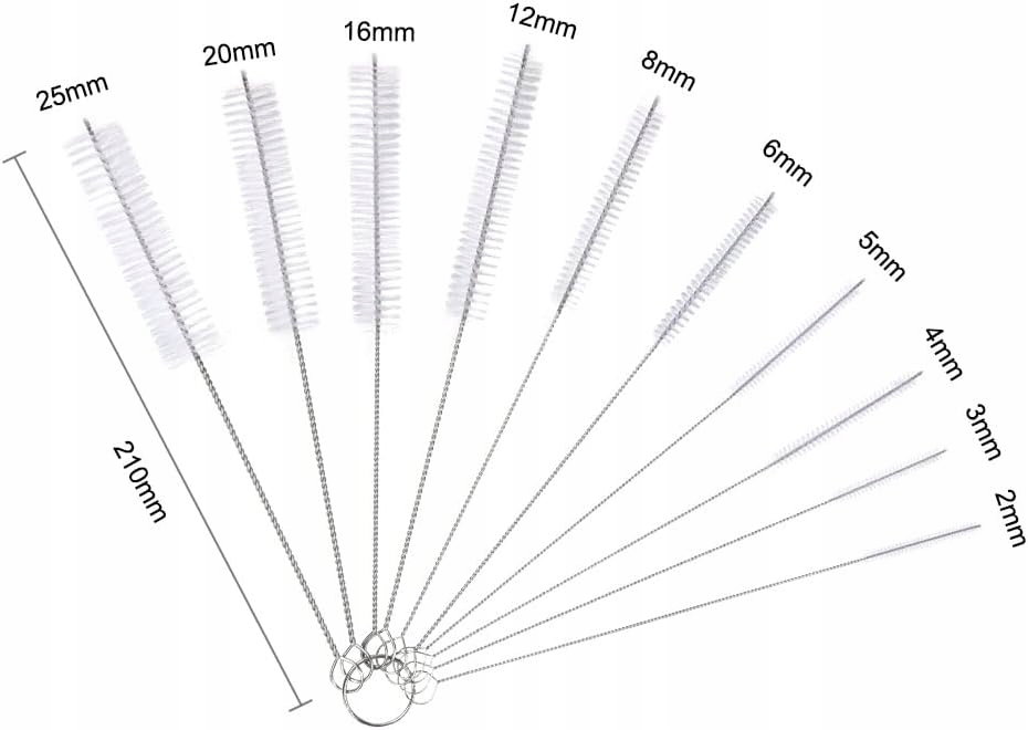 Różne rozmiary: opakowanie zawiera 10 szczotek nylonowych o różnych średnicach od 2 mm do 24 mm, wszystkie szczotki mają długość 200–210 mm.