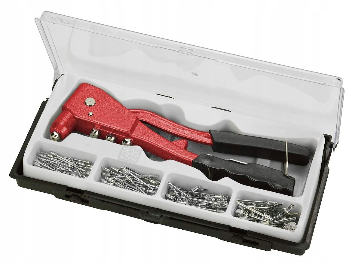 Najpierw odpowiednia wkładka do nitów zrywalnych powinna znajdować się na nitownikach ślepych. Wkładki mają średnicę 2,4 mm, 3,2 mm, 4,0 mm i 4,8 mm. Oczywiście w zestawie znajdują się również pasujące nity (po 25 sztuk).