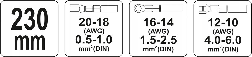 Szczypce YT-2300 do zaciskania konektorów nieizolowanych, z czernioną powierzchnią, która zabezpiecza przed korozją oraz nakładkami na rękojeść z tworzywa sztucznego. Dwustopniowy kształt szczęk ułatwia wstępne umieszczenie konektora nieizolowanego w zaciskarce, a mechanizm zapadkowy jego precyzyjne i solidne zaciśnięcie.