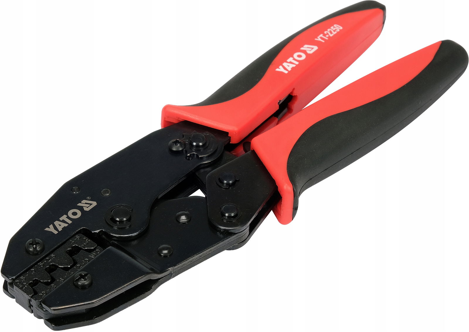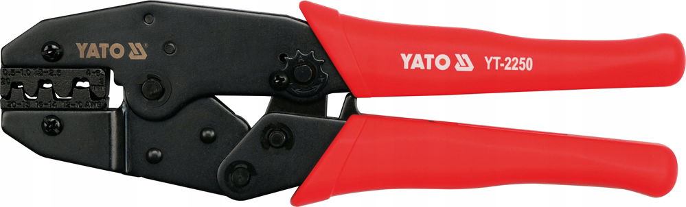 Szczypce YT-2250 do zaciskania konektorów nieizolowanych, z czernioną powierzchnią, która zabezpiecza przed korozją oraz dwukomponentowymi nakładkami na rękojeść z tworzywa sztucznego. Osadzony bezpośrednio na narzędziu twardszy komponent z PP mocno przylega do korpusu, a zewnętrza część z TPR jest przyjemna w dotyku i posiada antypoślizgowe właściwości. Dwustopniowy kształt szczęk ułatwia wstępne umieszczenie konektora nieizolowanego w zaciskarce, a mechanizm zapadkowy jego precyzyjne i solidne zaciśnięcie.