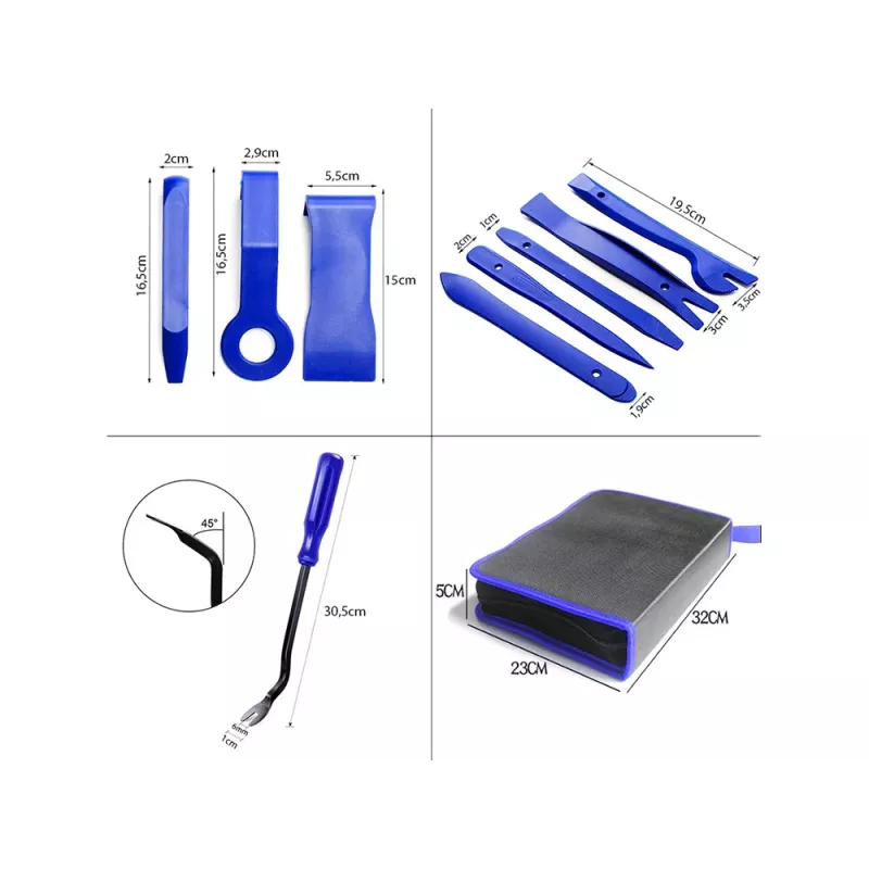Specjalistyczne ściągacze do demontażu tapicerki, spinek i listew samochodowych. Przydają się również przy wyjmowaniu radia samochodowe, licznika, sprzętu elektronicznego na zatrzaski. Otwieraki wykonane z mocnego tworzywa, dzięki nim nie wyszczerbisz rantów tapicerki podczas jej podważania. Zaletą