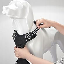 Włóż głowę psa do pasa piersiowego za pomocą odpinanej klamry