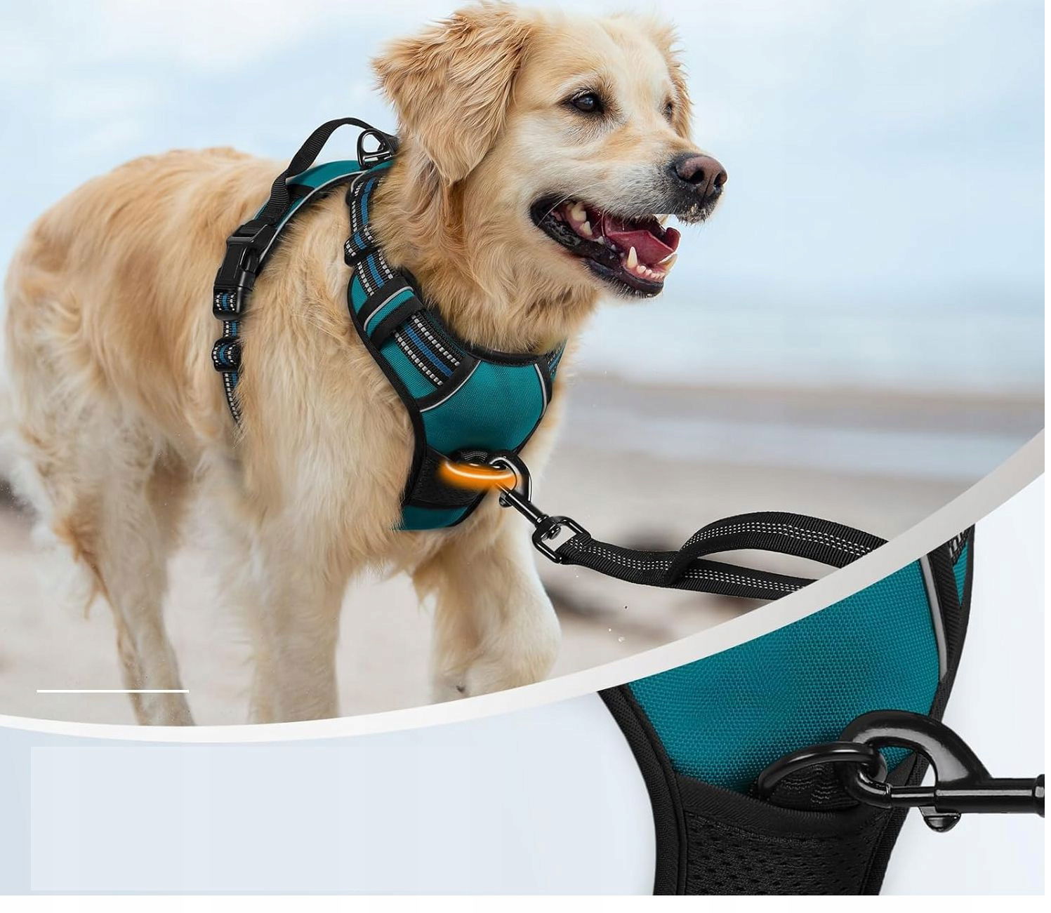 Łatwe w użyciu - dzięki 2 szybko odpinanym klamrom. Wsuń szelki na głowę psa, zapnij ją, WYREGULUJ paski i gotowe! Chwyć górny uchwyt, aby uzyskać dodatkową kontrolę.