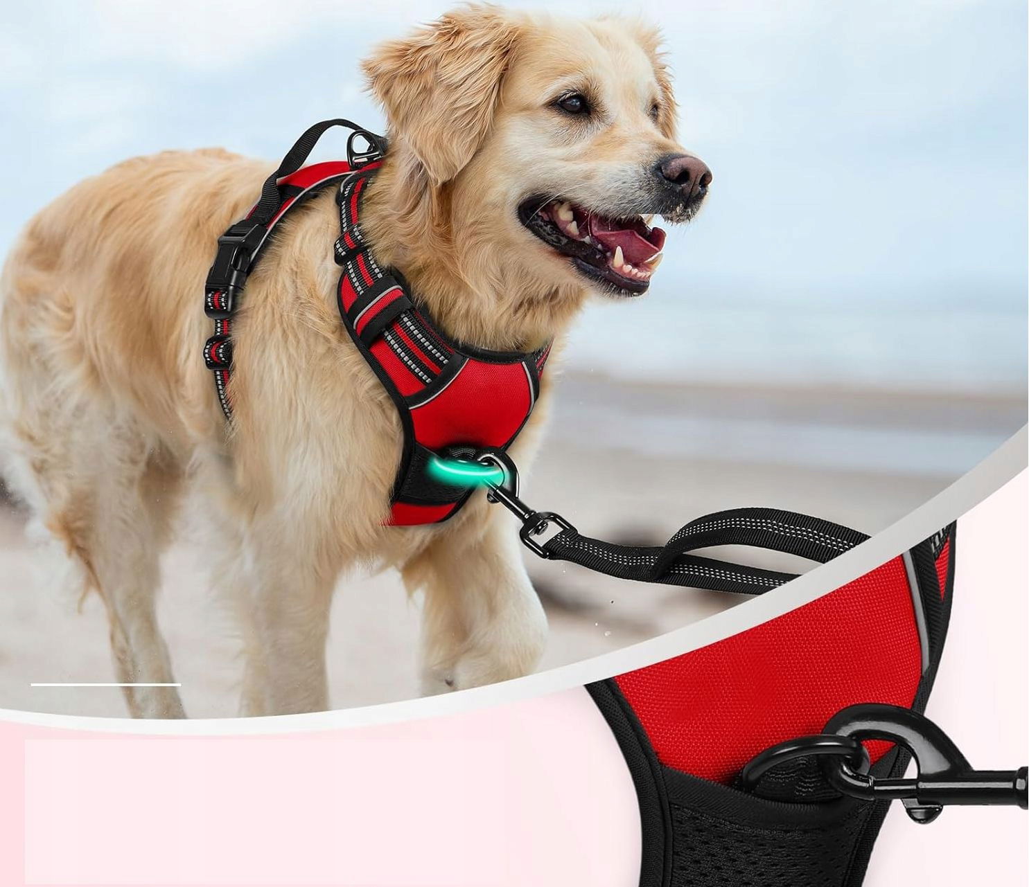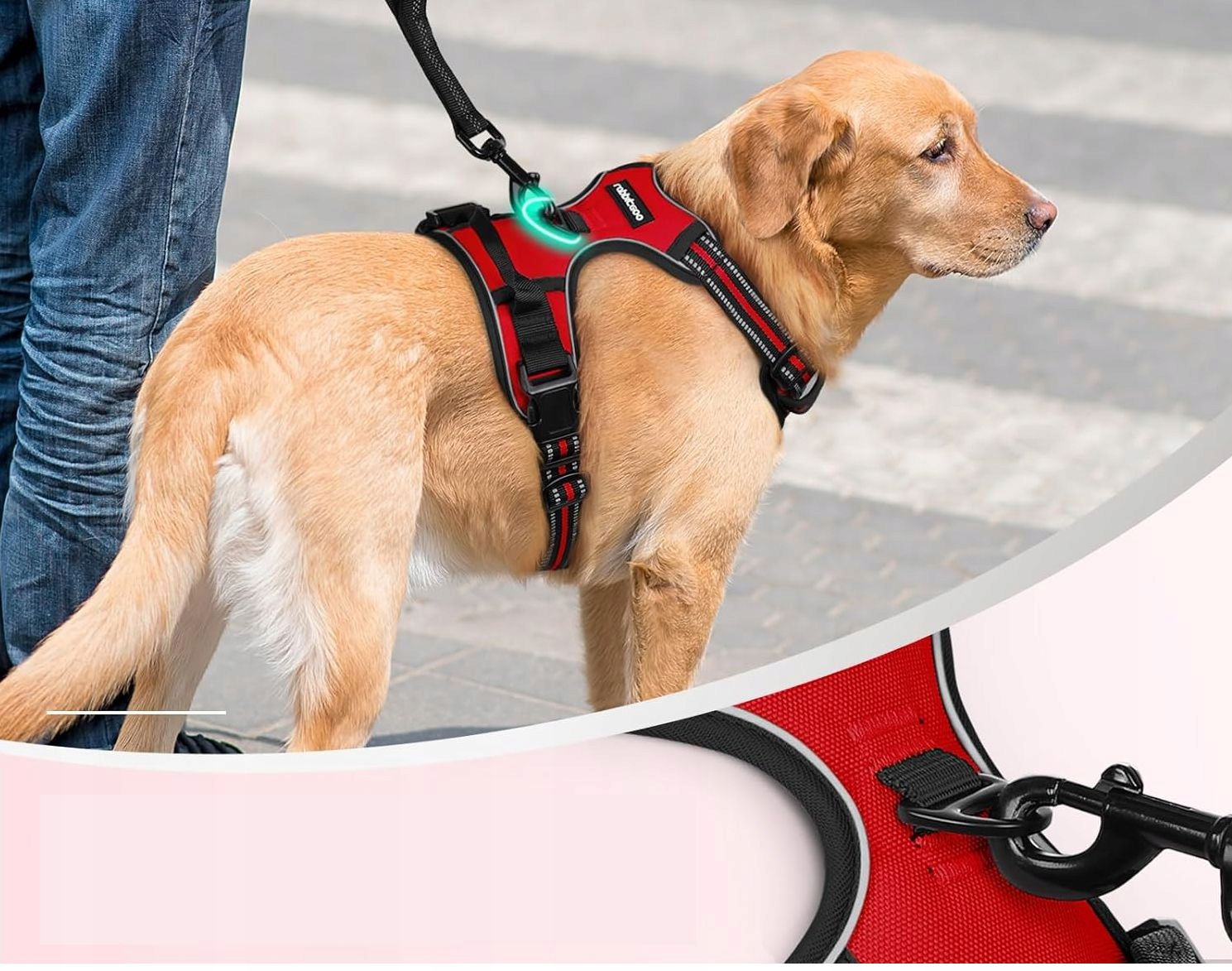 Łatwe w użyciu - dzięki 2 szybko odpinanym klamrom. Wsuń szelki na głowę psa, zapnij ją, WYREGULUJ paski i gotowe! Chwyć górny uchwyt, aby uzyskać dodatkową kontrolę.