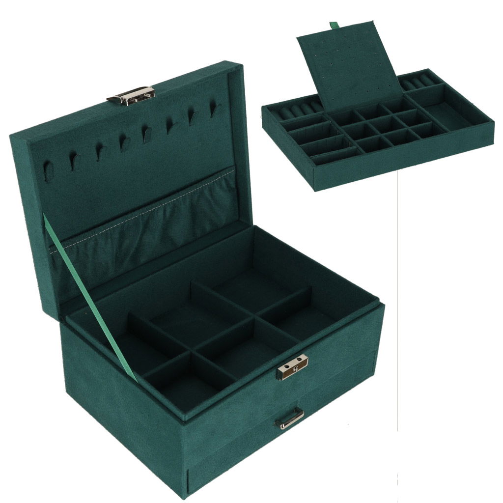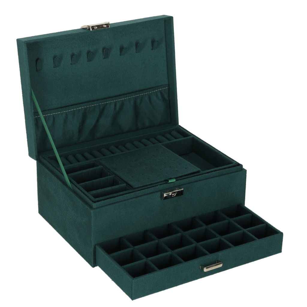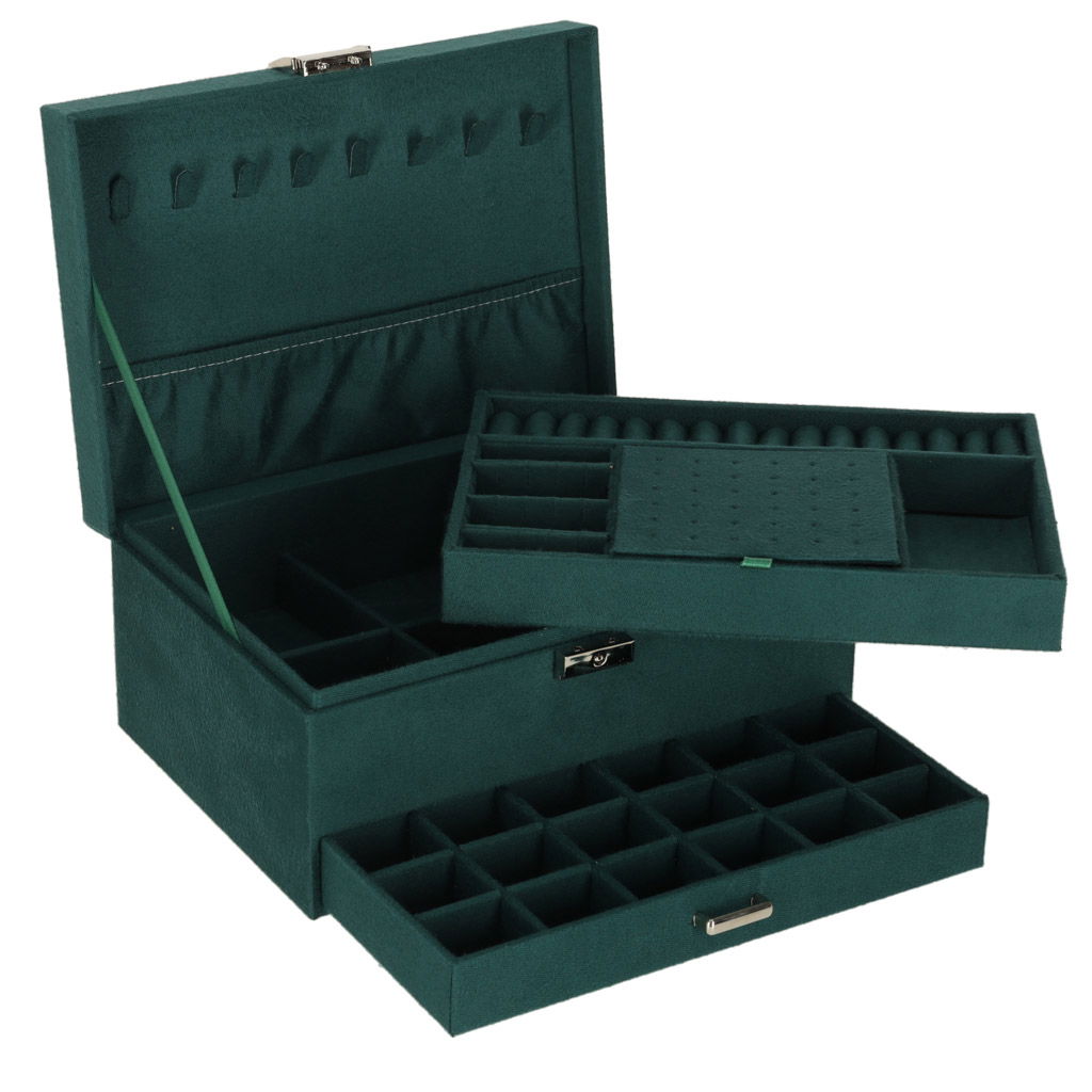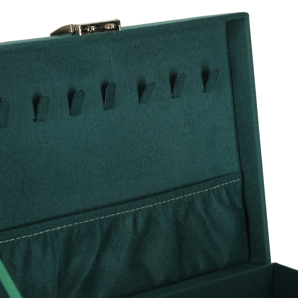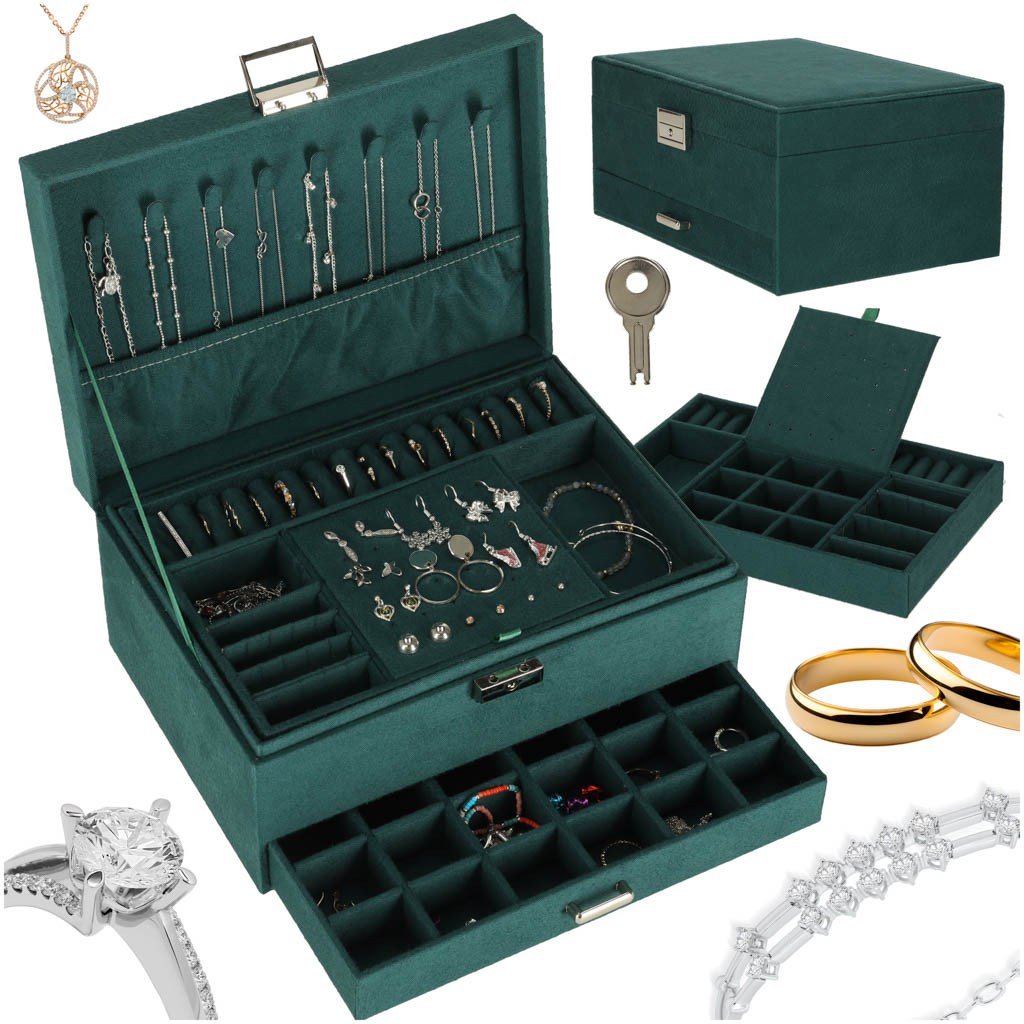 POJEMNY I FUNKCJONALNY ORGANIZER NA BIŻUTERIĘ - Ten zielony kuferek na biżuterię z kluczykiem to doskonały sposób na przechowywanie całej kolekcji dodatków w jednym miejscu. Posiada aż 40 przegródek, które możesz dowolnie konfigurować dzięki ruchomym ściankom działowym. Doskonale nadaje się do przechowywania pierścionków, kolczyków, łańcuszków i broszek.