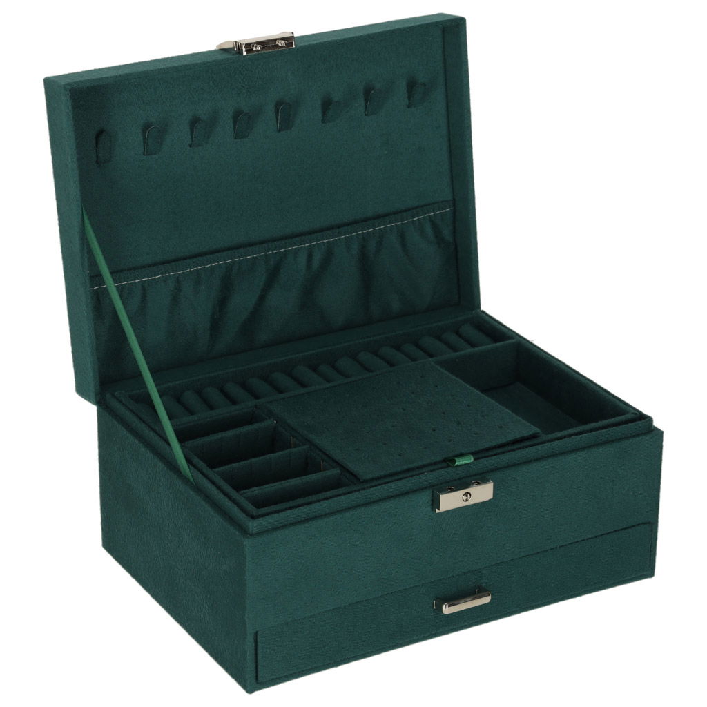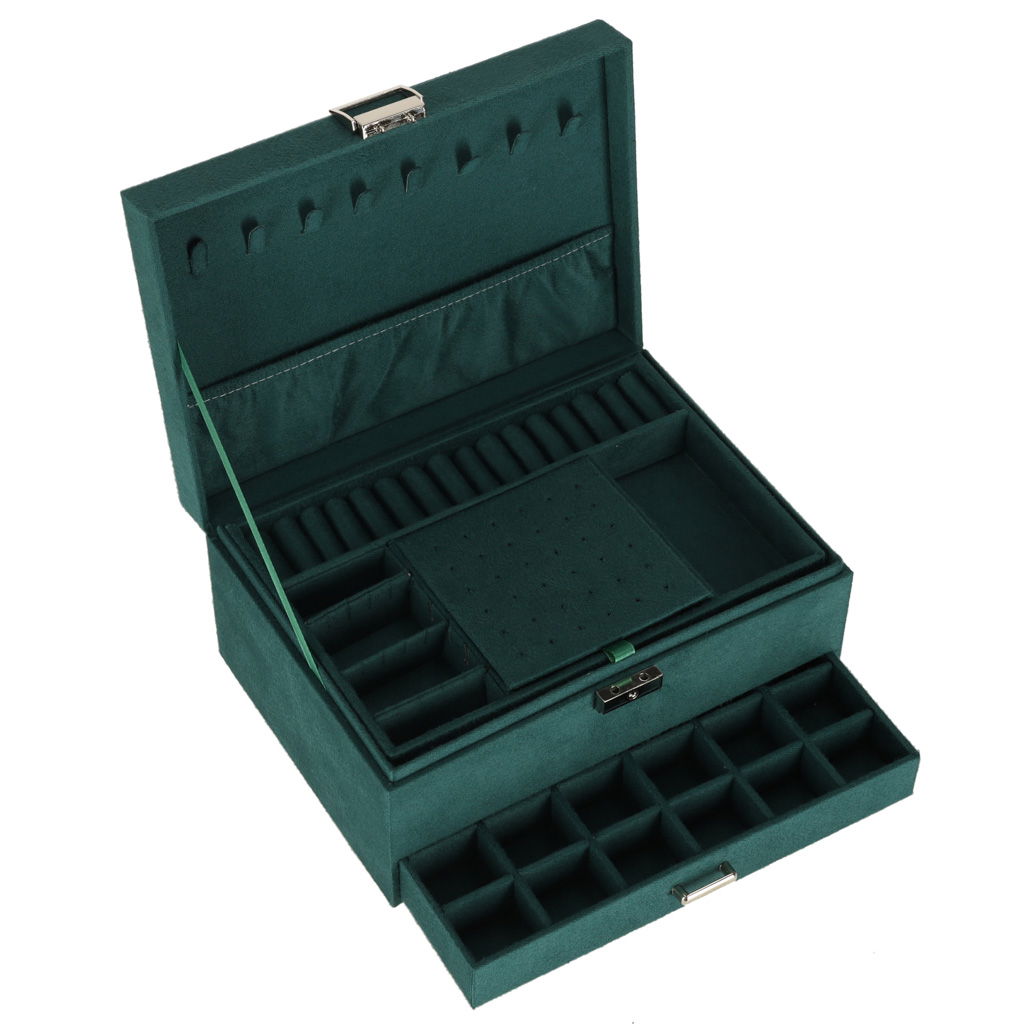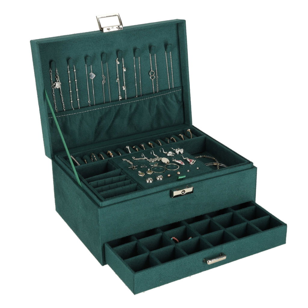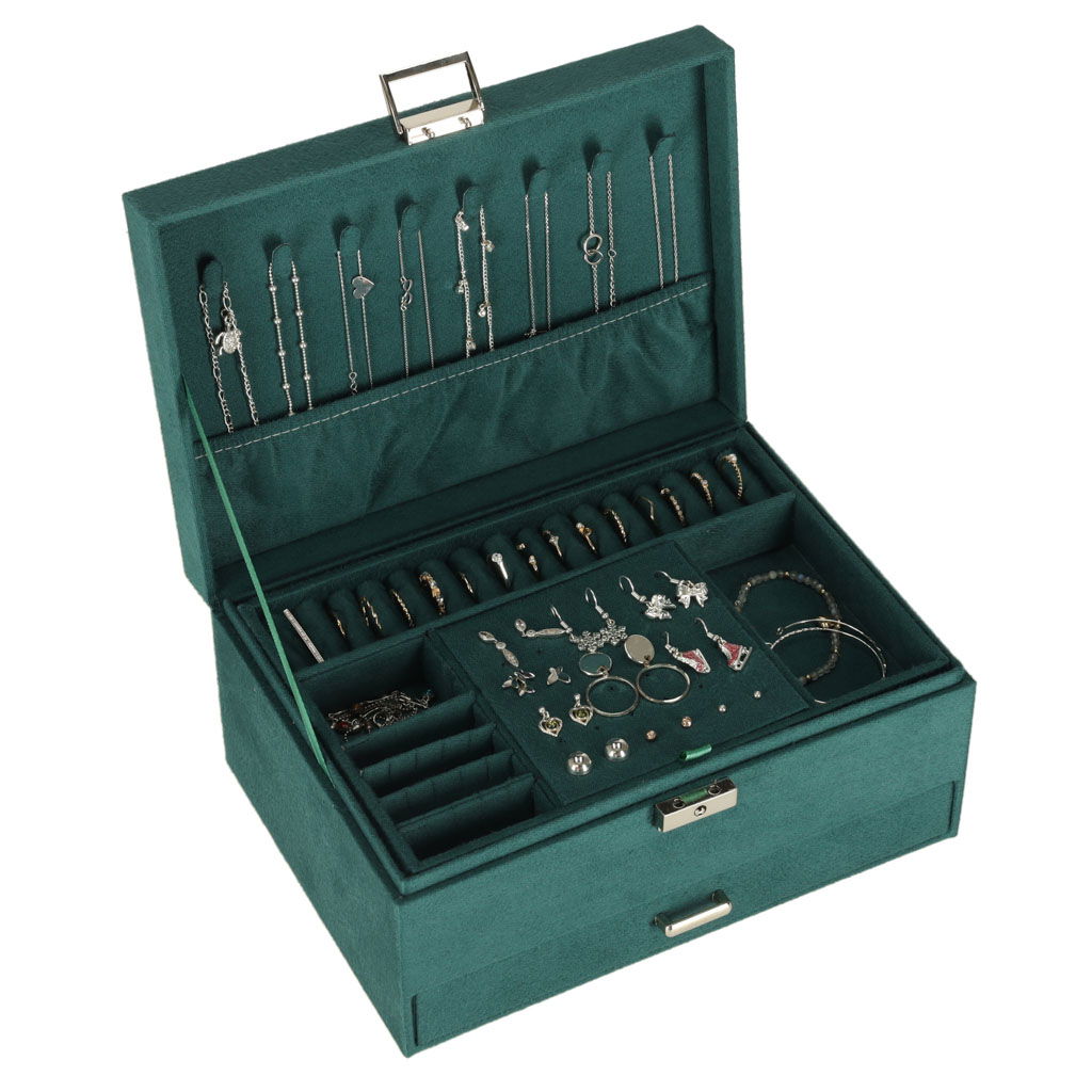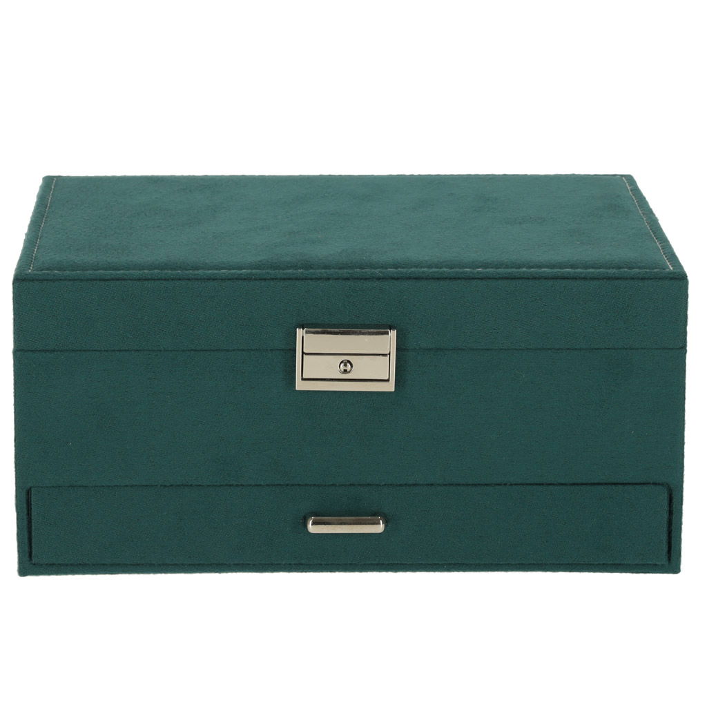 POJEMNY I FUNKCJONALNY ORGANIZER NA BIŻUTERIĘ - Ten zielony kuferek na biżuterię z kluczykiem to doskonały sposób na przechowywanie całej kolekcji dodatków w jednym miejscu. Posiada aż 40 przegródek, które możesz dowolnie konfigurować dzięki ruchomym ściankom działowym. Doskonale nadaje się do przechowywania pierścionków, kolczyków, łańcuszków i broszek.