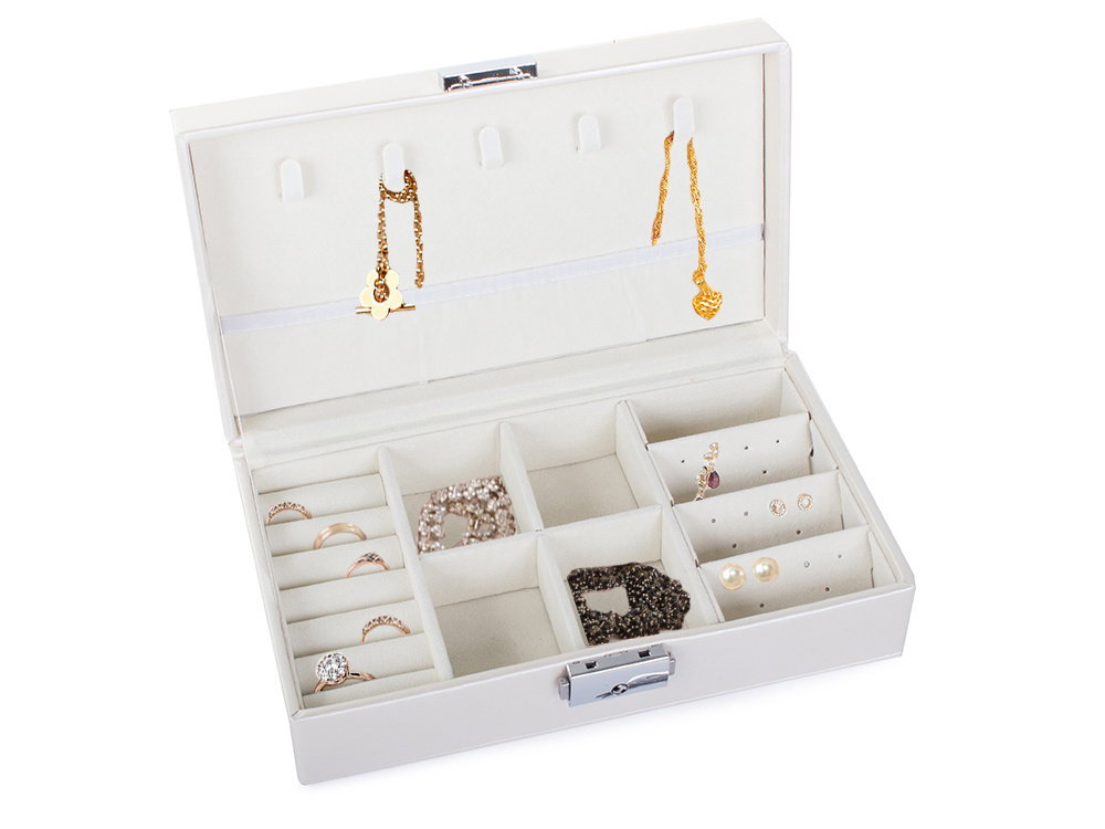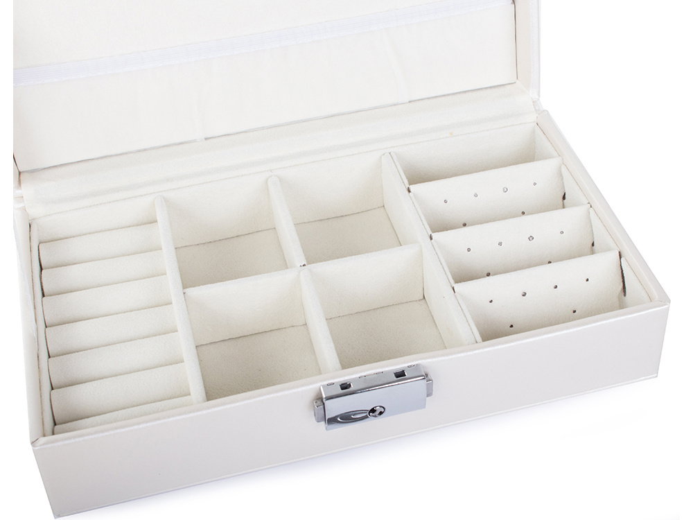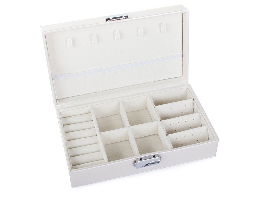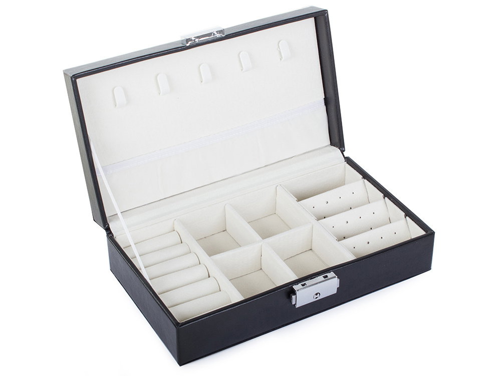Duża, bardzo pojemna szkatułka, pozwoli na uporządkowanie wszelkiego rodzaju biżuterii oraz zegarków. Organizer wyposażony jest w różnego rodzaju oraz wielkości przegródek, które z powodzeniem pomieszczą dużą ilość pierścionków, łańcuszków, kolczyków, bransoletek i itp.