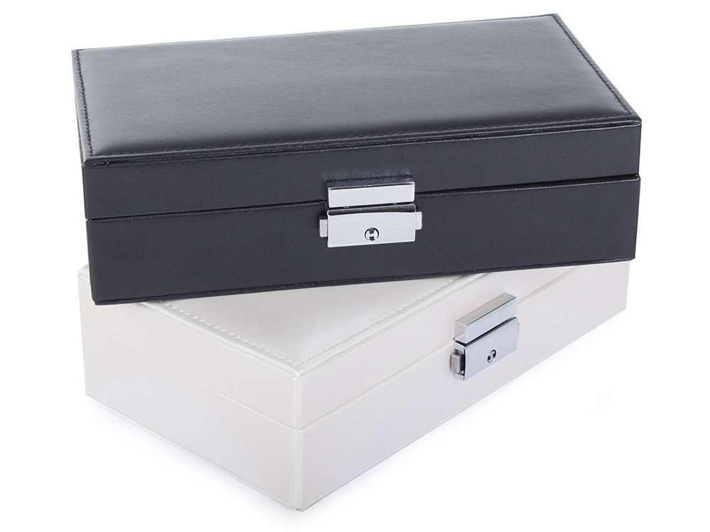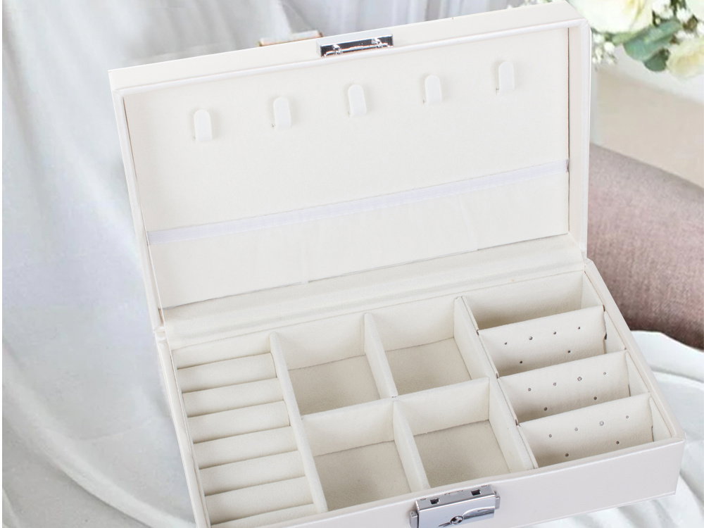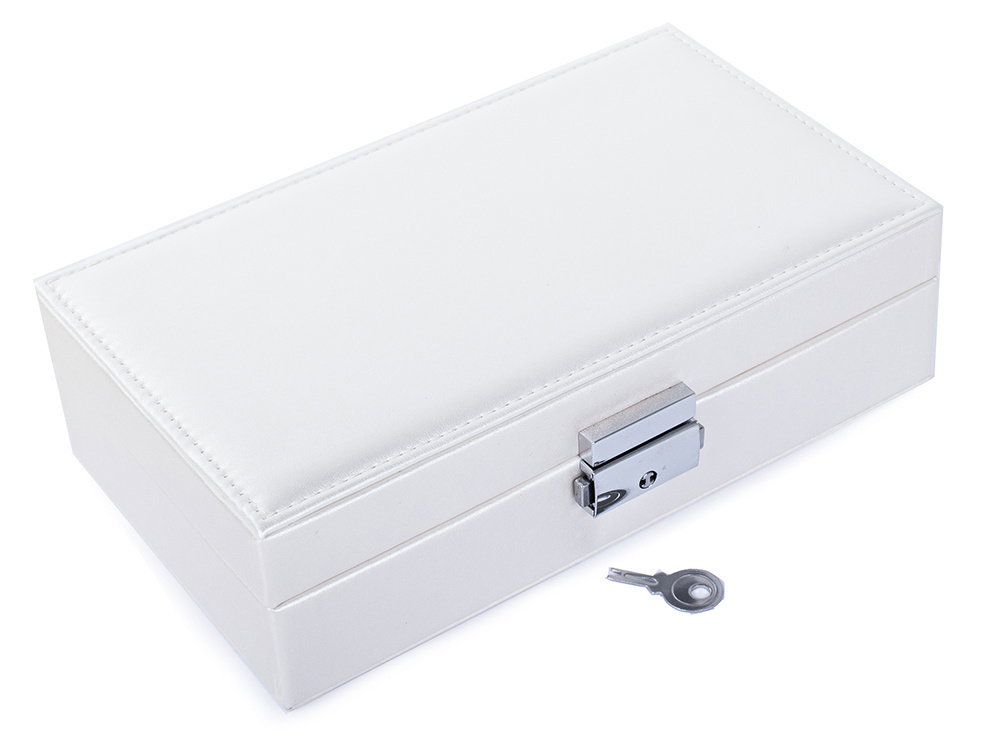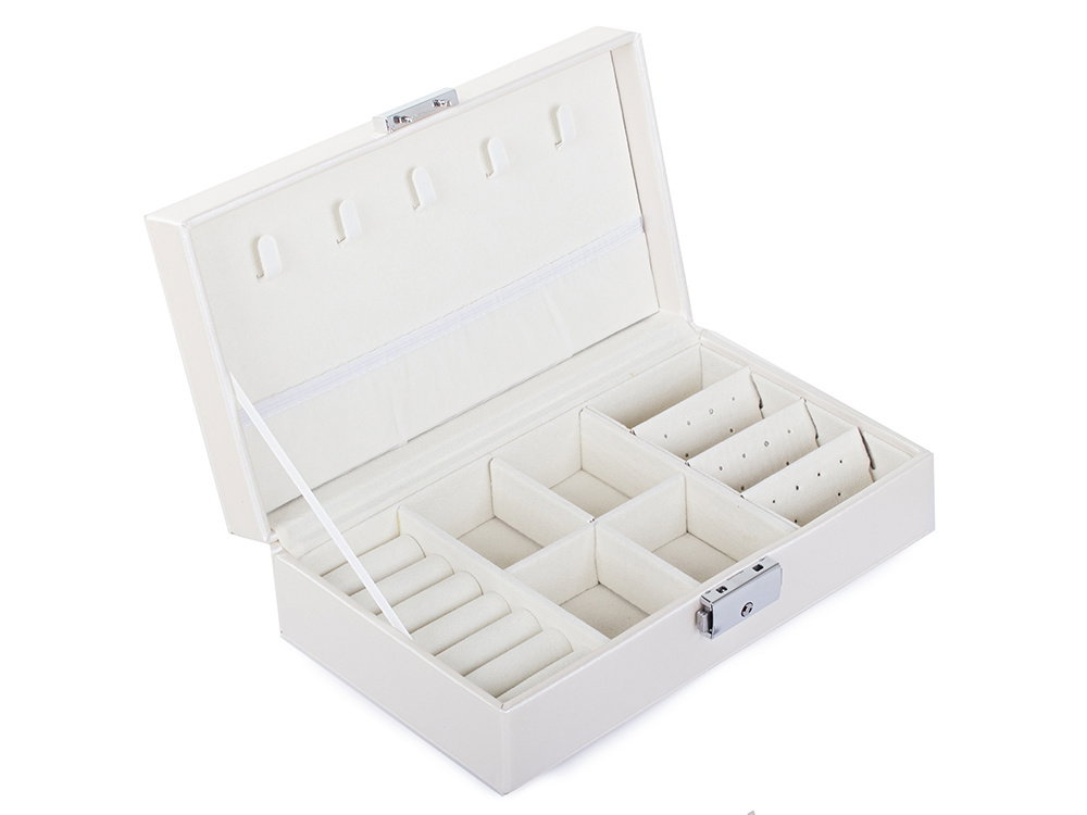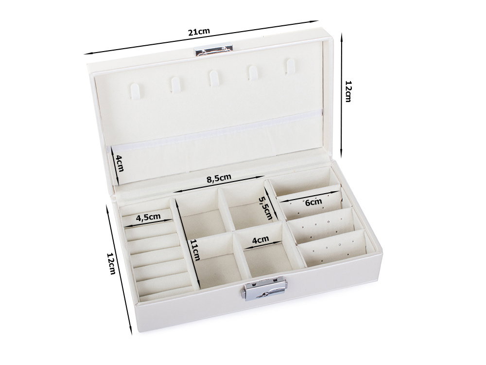 Duża, bardzo pojemna szkatułka, pozwoli na uporządkowanie wszelkiego rodzaju biżuterii oraz zegarków. Organizer wyposażony jest w różnego rodzaju oraz wielkości przegródek, które z powodzeniem pomieszczą dużą ilość pierścionków, łańcuszków, kolczyków, bransoletek i itp.