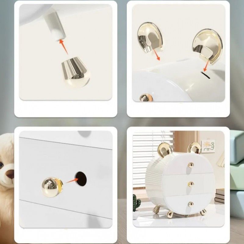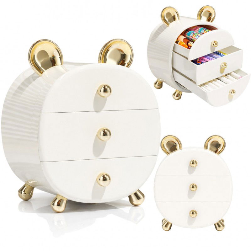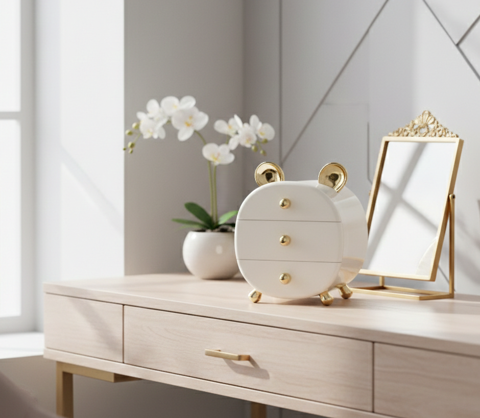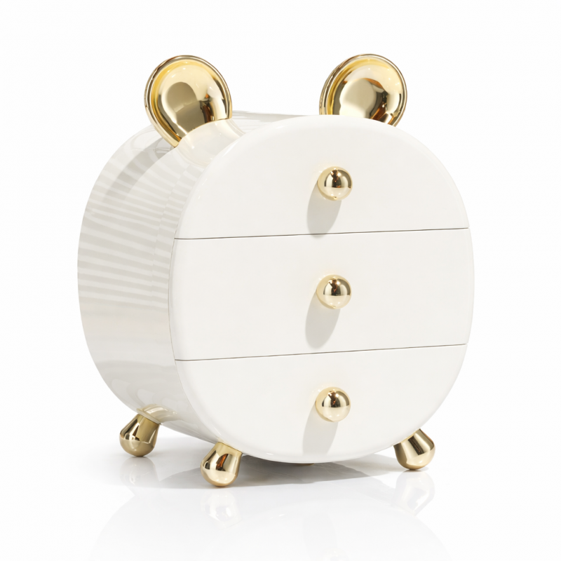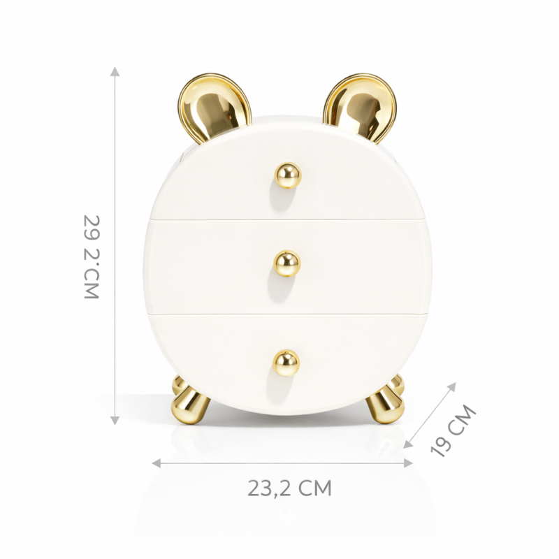 📦 Przedstawiamy wyjątkowy organizer szkatułka na kosmetyki i biżuterię BEAR ze złotymi uszkami CB77 – idealny sposób na uporządkowanie Twoich akcesoriów oraz dodanie uroku każdej toaletce! Ten piękny organizer łączy w sobie praktyczność i styl, a jego wyjątkowy design przyciąga wzrok i stanowi doskonałą dekorację wnętrza.
