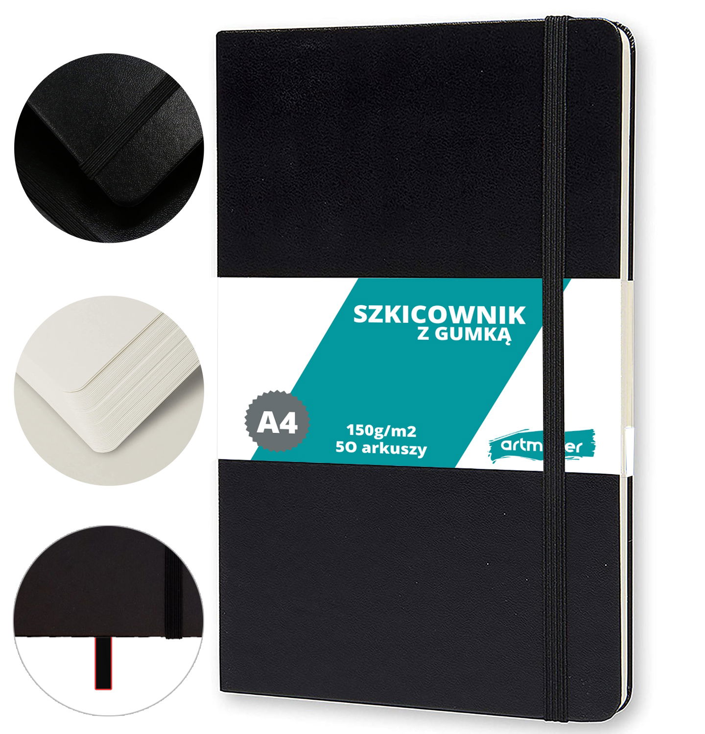 Szkicownik A4 w twardej oprawie z gumką 50 ark wysoka gramatura 150g czarny