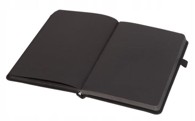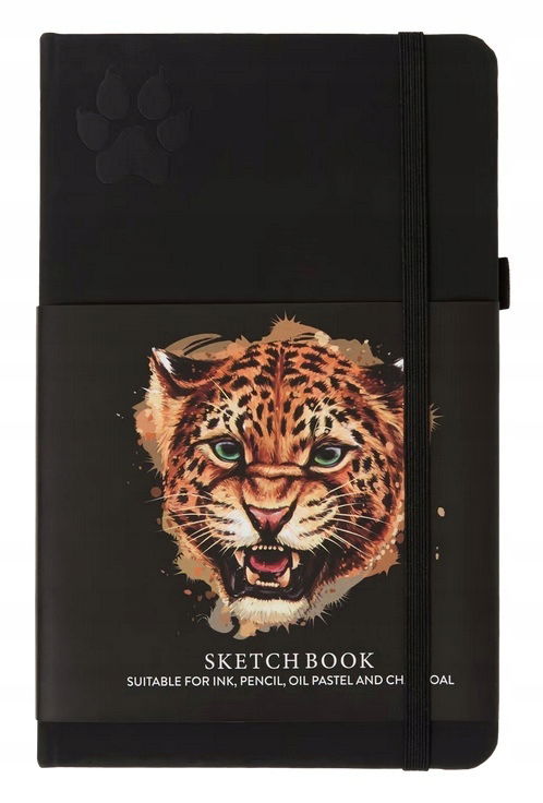 Czarna miła w dotyku okładka z wytłoczonym emblematem - motywem z okałdki szkicownika (motyl, kwiat, łapa pantery)