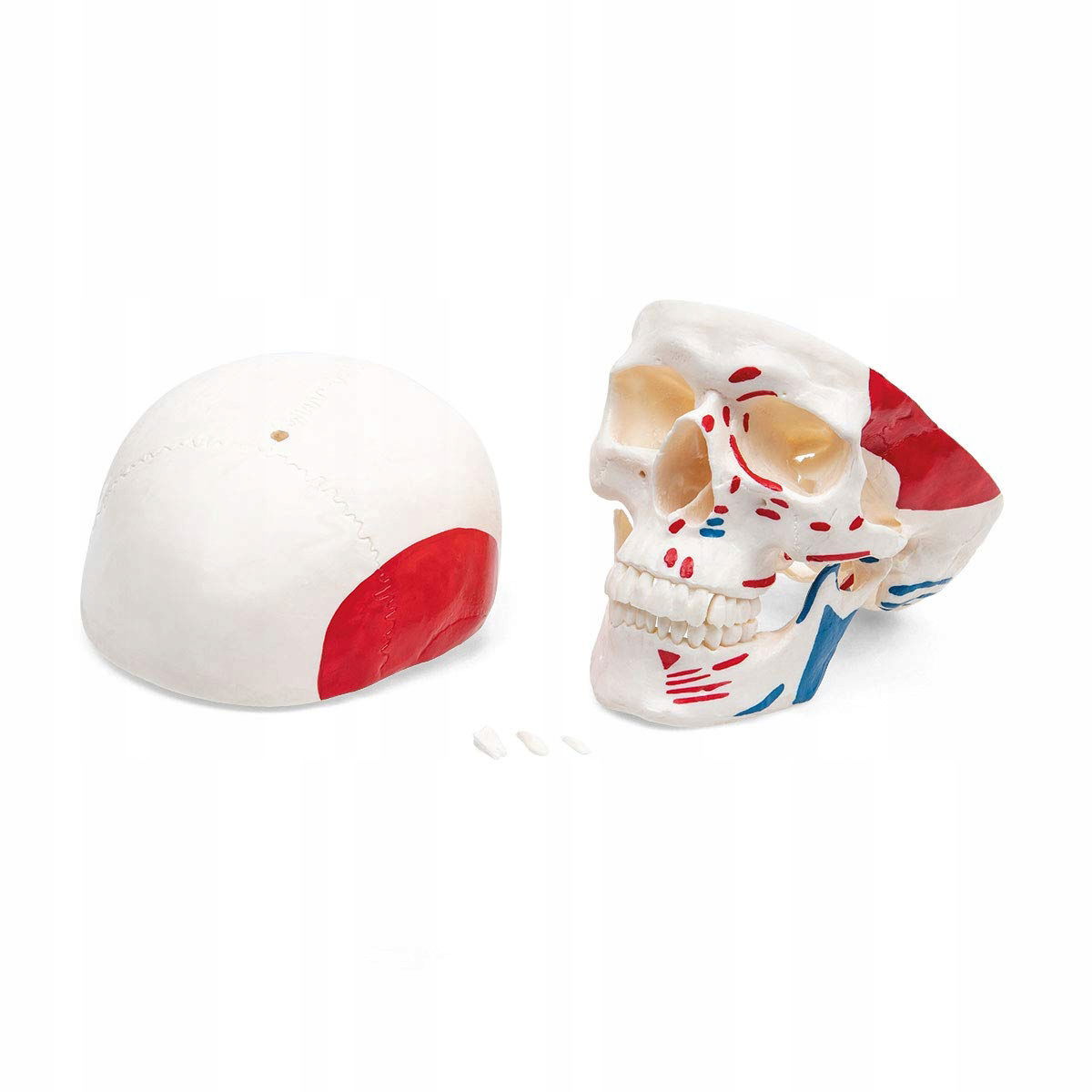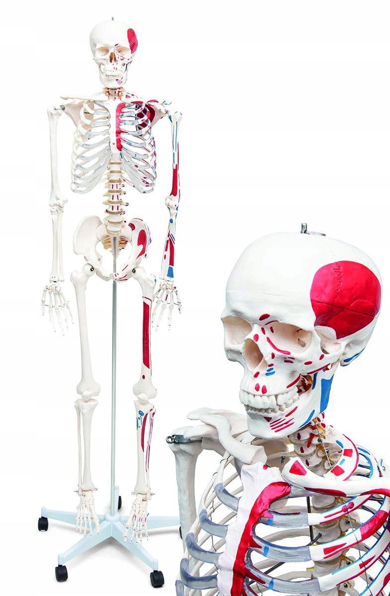 Po lewej stronie szkieletu są kolorowo widoczne skoki mięśni (czerwone) i nasady (niebieskie). Ramiona i nogi są łatwo zdejmowane i dostarczane z trzyczęściową czaszką.
