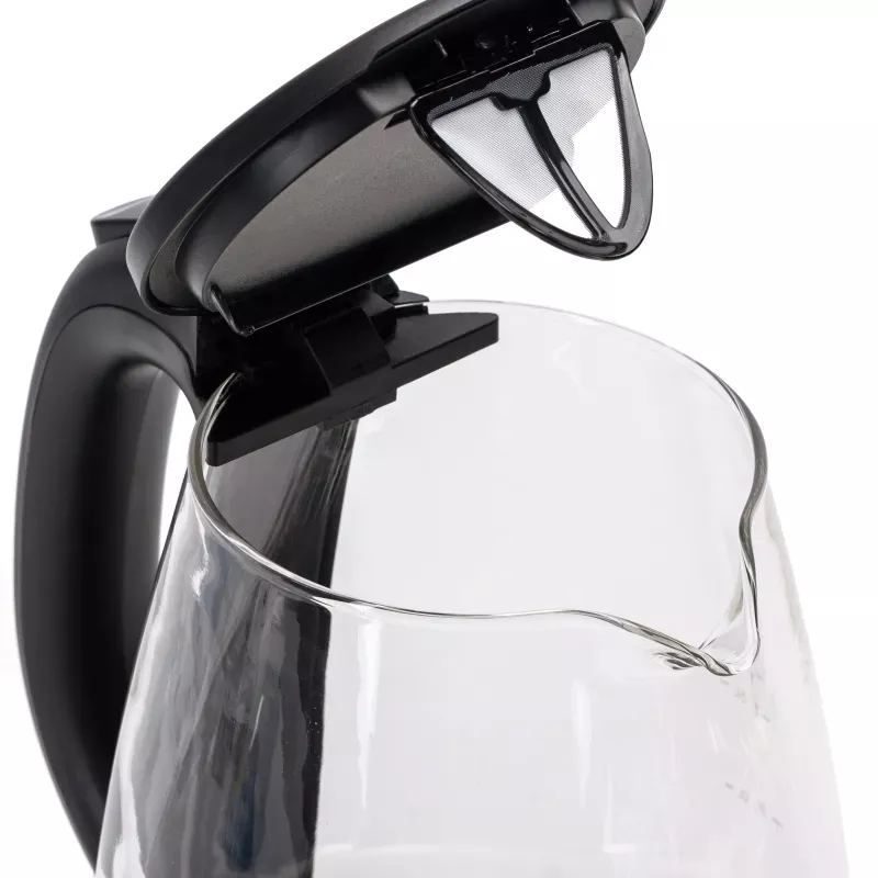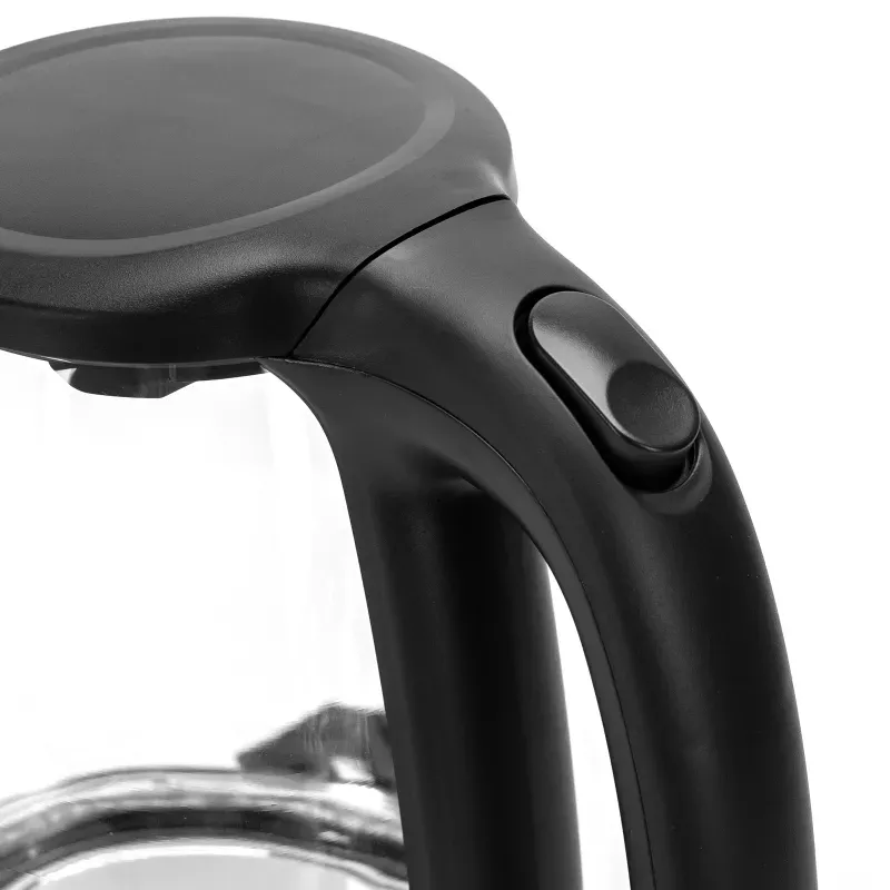 Praktyczny i stylowy czajnik elektryczny z szkła i czarnego tworzywa sztucznego o pojemności 1,7 litra. Idealny do szybkiego podgrzewania wody na herbatę, kawę i nie tylko.. Zabezpieczenie przed gotowaniem na sucho. Podstawa może być obracana o 360 stopni i odłączona/wyjmowana.