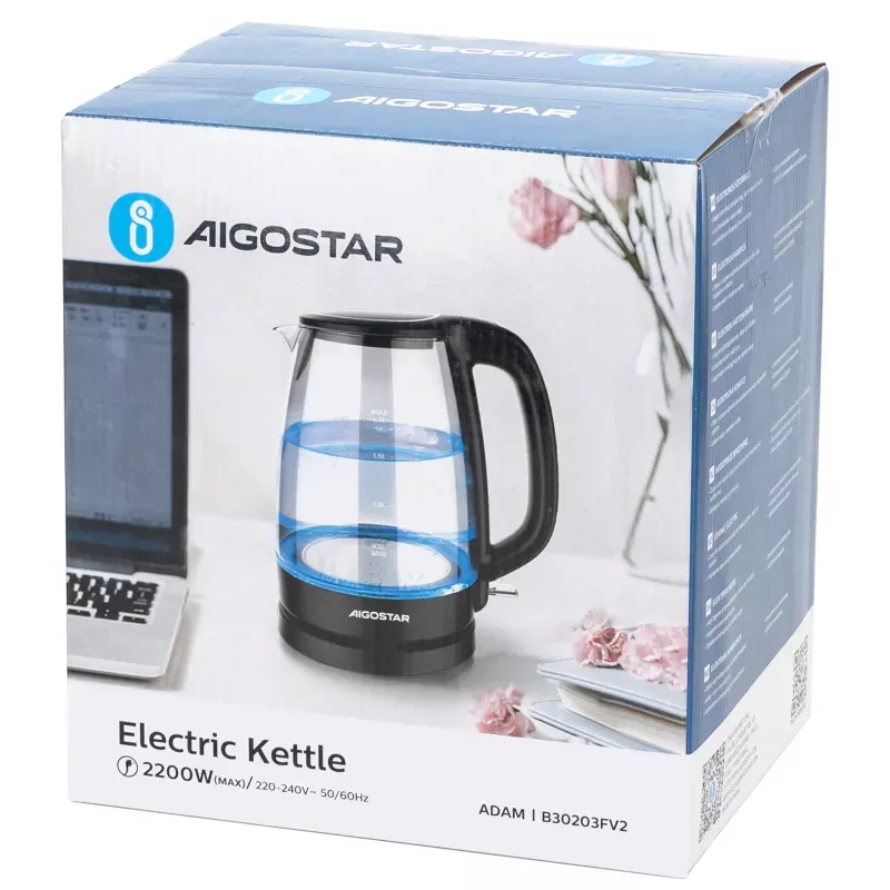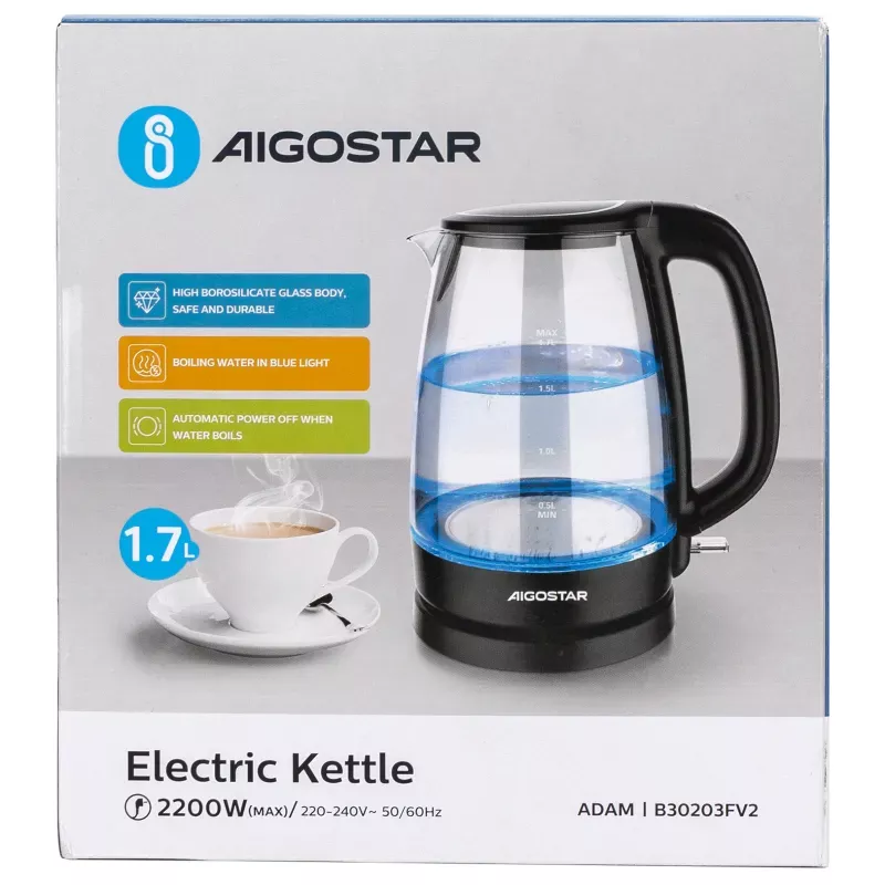 Szklany czajnik elektryczny Adam 1,7l 2200W z niebieskim podświetleniem