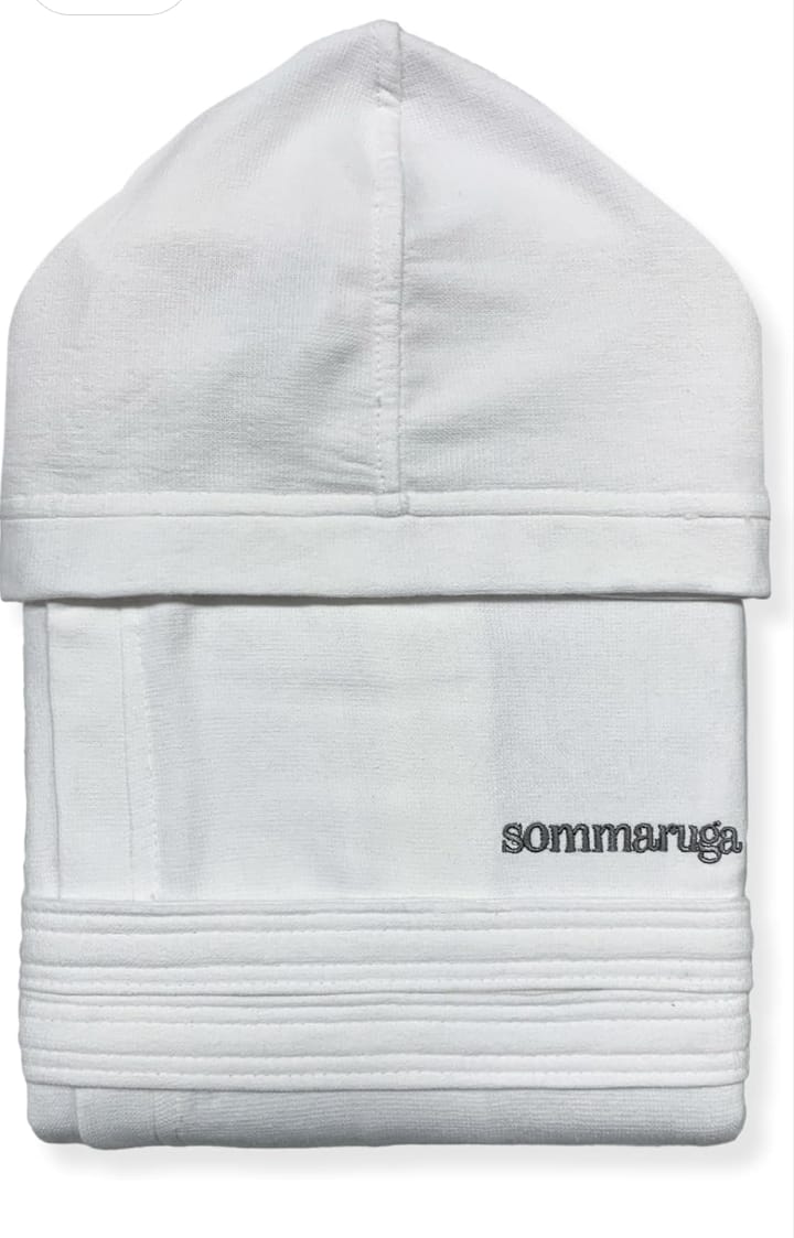 Szlafrok bawełniany unisex z kapturem ,kieszeniami i paskiem, wyjątkowy model ,absolutna nowość na rynku która podbija serca Europejczyków swoja wyjątkowością , szlafrok wykonany 100% bawełnie. Wierzchnia część jest gładka , natomiast wewnętrzna to frotte . Bardzo oryginalny i unikalny szlafrok jest ideałem w saunie , doskonały dla sportowców i do podróży .Wszechstronnie praktyczny , zadowoli Państwa wymogi .Na lewej piersi haftowane logo Sommaruga. wykonany przez włoską firmę z Neapolu .