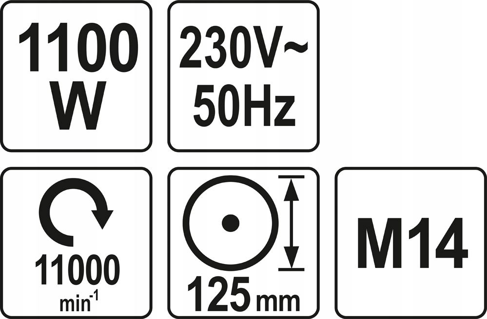 Moc 1100W;Tarcza 125MM;Trzpień mocujący 22MM; Gwint M14; 11.000 obr/min; Przeznaczenie / zastosowanieDo cięcia i szlifowania metalu i materiałów mineralnychSposób użyciaZ tarczami o rozmiarze 125mm i otworze mocującym 22,23mmZawartość opakowaniaSzlifierka kątowa 1100W; Klucz do mocowania tarczy; osłona tarczy; instrukcja;