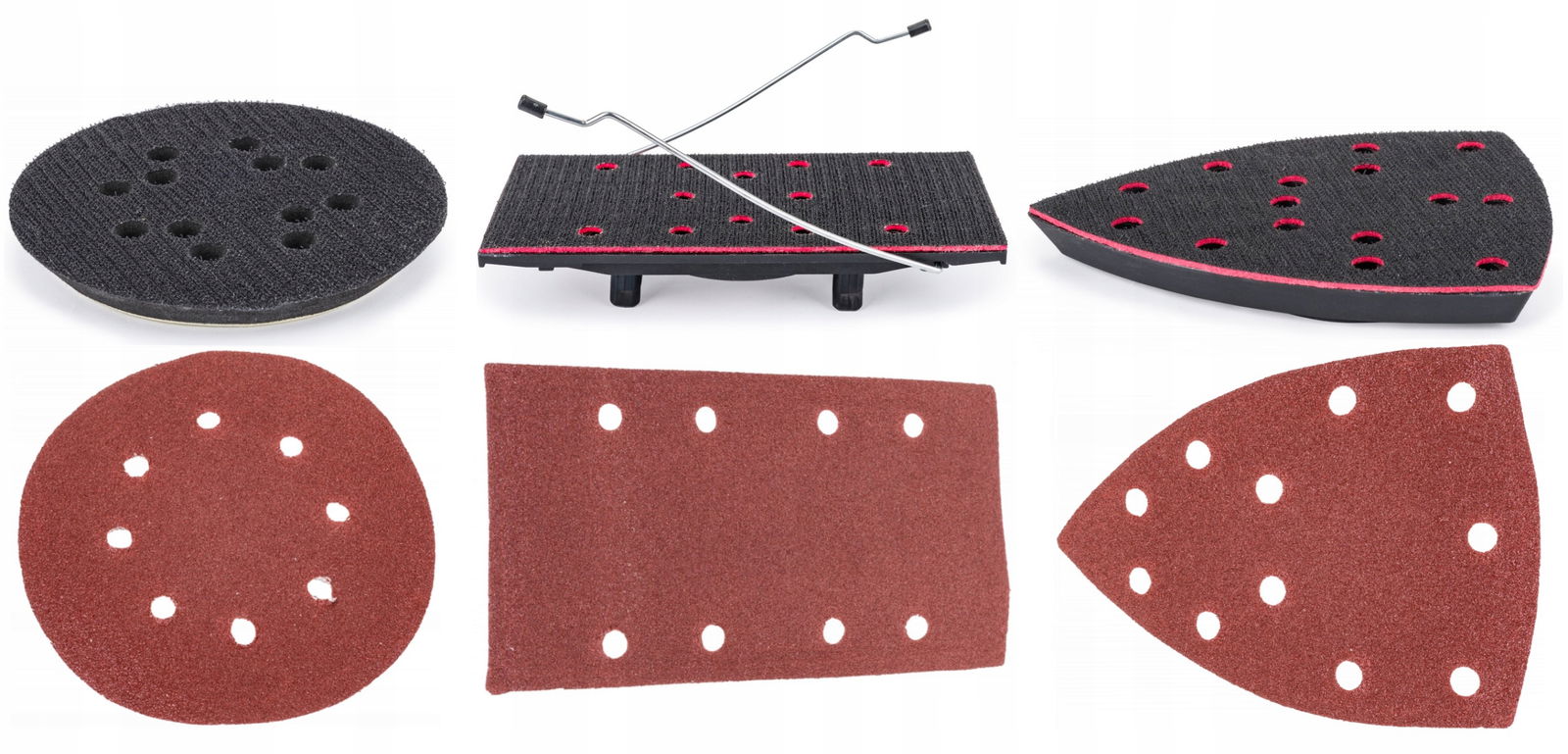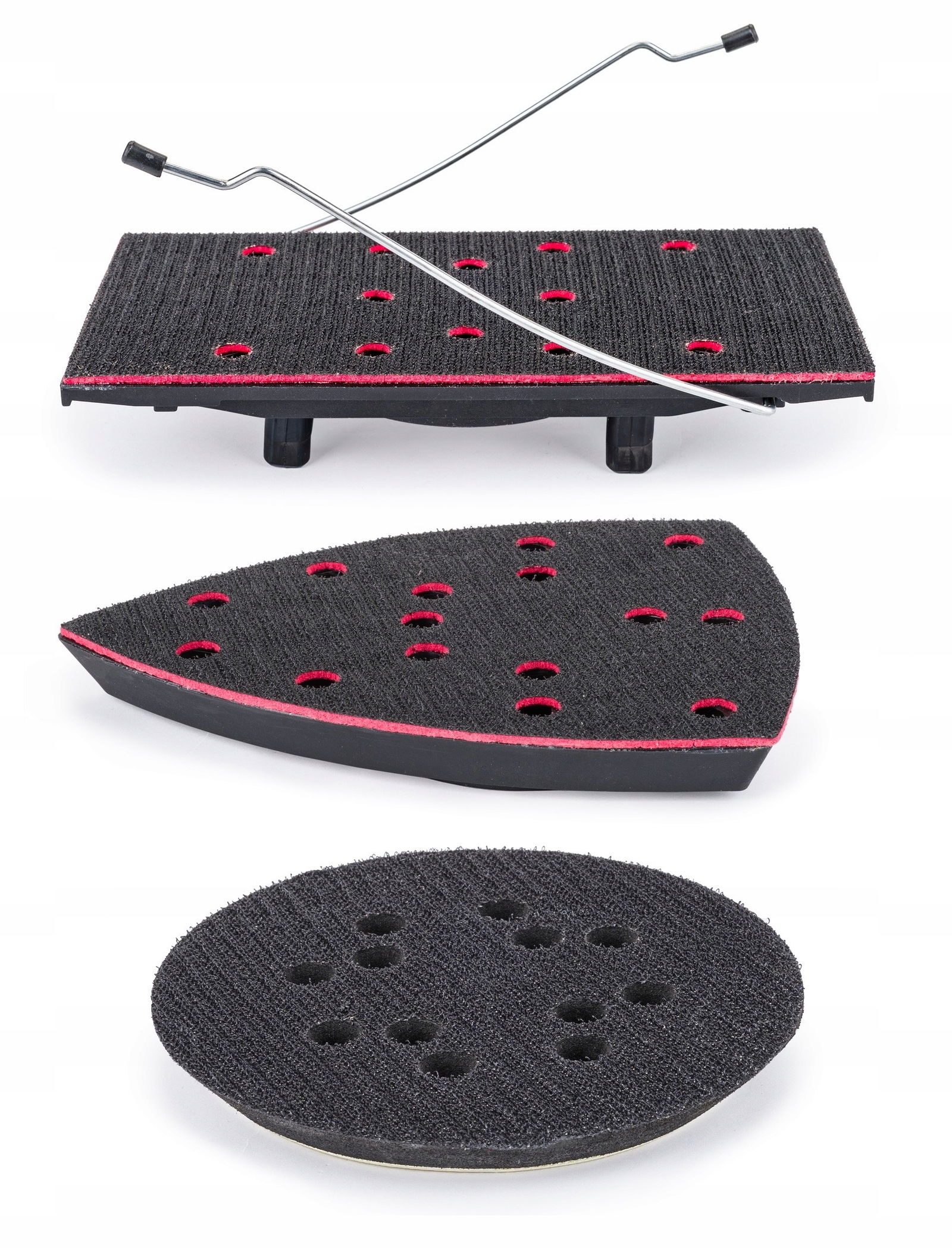 W celu szlifowania wielofunkcyjnego - mimośrodowego i oscylacyjnego szlifierka posiada możliwość zamontowania 3 różnych padów szlifierskich (Orbitalny - do szlifowania płaskich powierzchni; Trójkątny - do szlifowania powierzchni nierównych; Prostokątny - do szlifowania narożników i krawędzi).