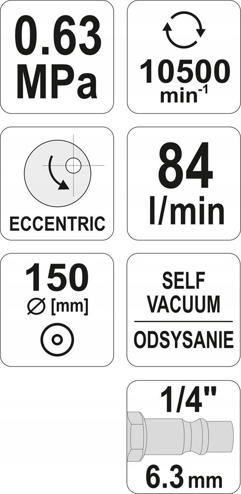 Szlifierka mimośrodowa pneumatyczna jest narzędziem zasilanym strumieniem sprężonego powietrza pod odpowiednim ciśnieniem. W zestawie znajduje się wąż umożliwiający podłączenie szlifierki pod odkurzacz - oraz specjalny worek na urobek. Oscylacja 5mm zapewnia optymalną obróbkę powierzchni. Dzięki środkom ściernym nakładanym bezpośrednio na tarcze możliwe jest szlifowanie i polerowanie różnego rodzaju materiałów. Szlifierka jest wyposażona w złączkę pozwalającą przyłączyć ją do układu pneumatycznego. Szlifierka jest wyposażona w tarczę o średnicy 150 mm. Do montażu tarczy nie są wymagane żadne narzędzia dodatkowe.