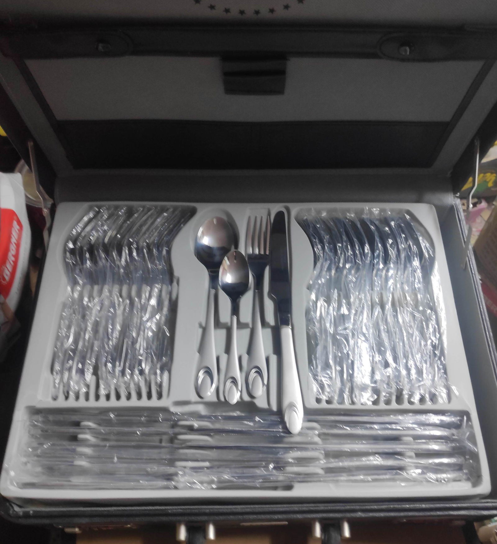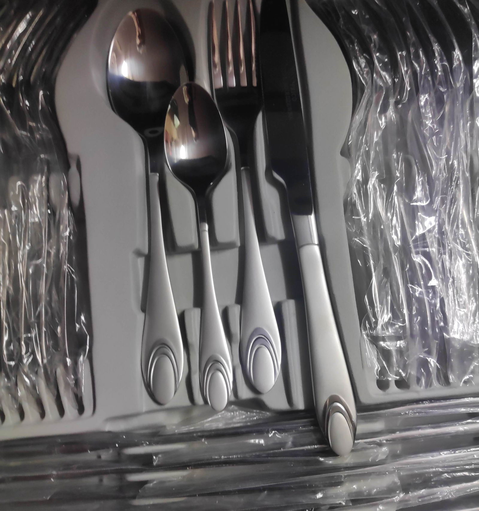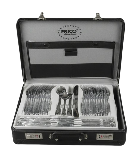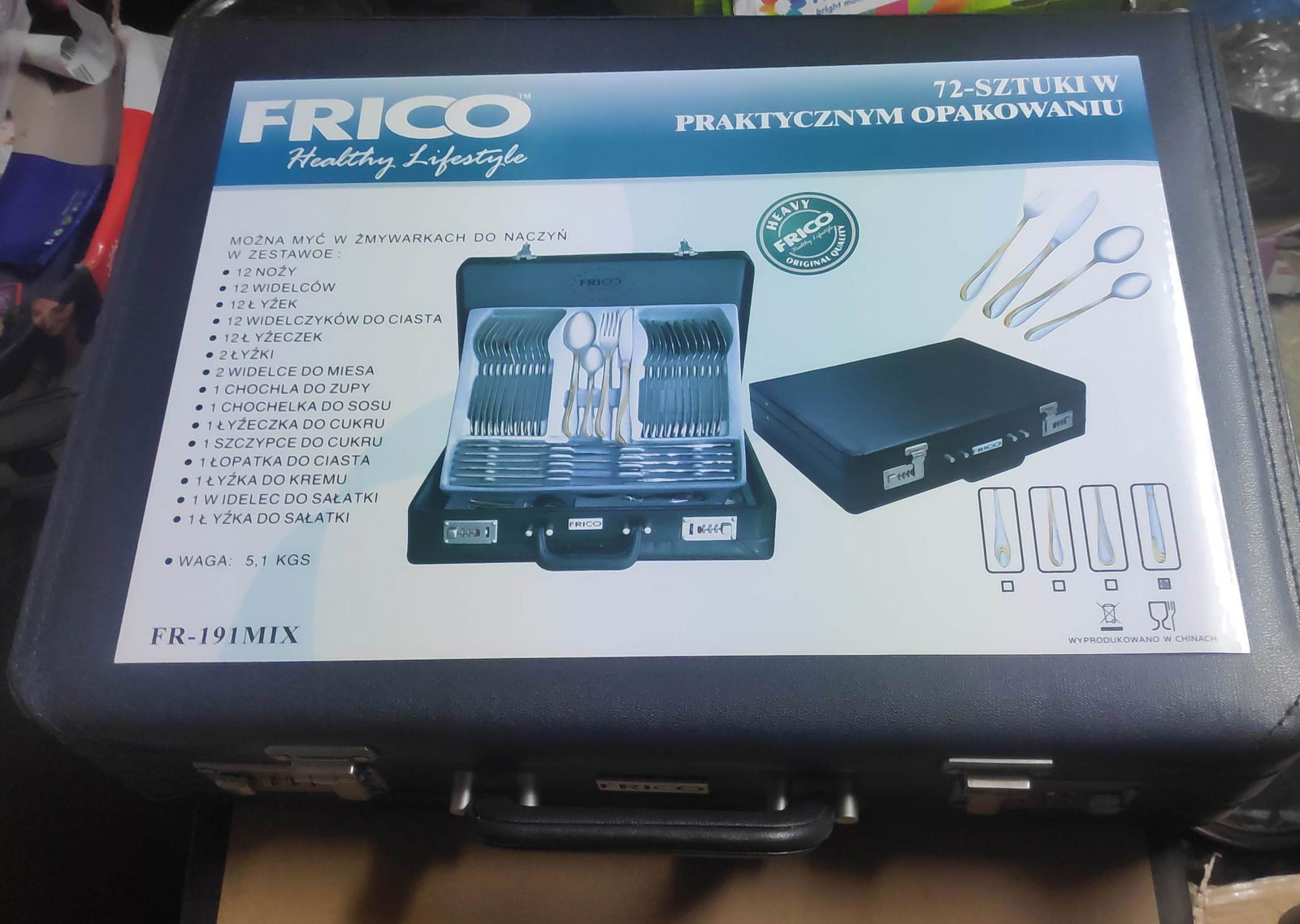 Komplet sztućców Frico w eleganckim czarnym etui. Zestaw zawiera 72 elementy, w tym widelce, noże, łyżki stołowe i deserowe, odpowiednie dla 12 osób. Sztućce wykończone są w stylu satynowym Marka Frico.