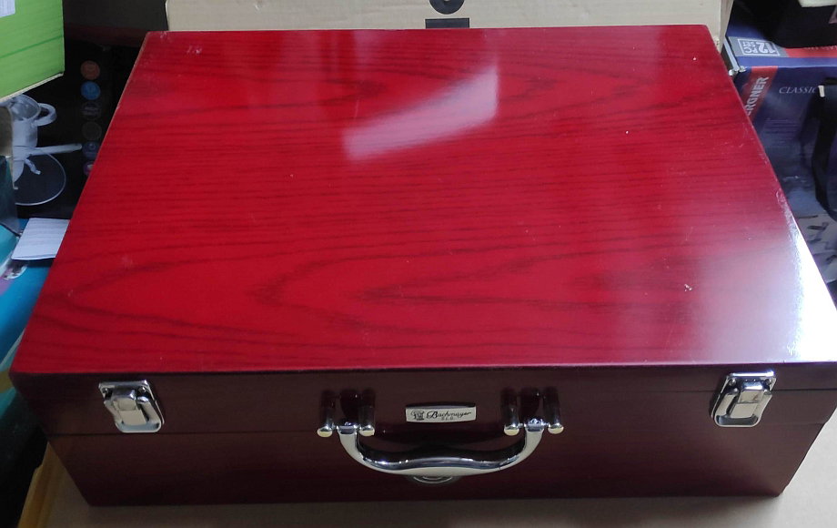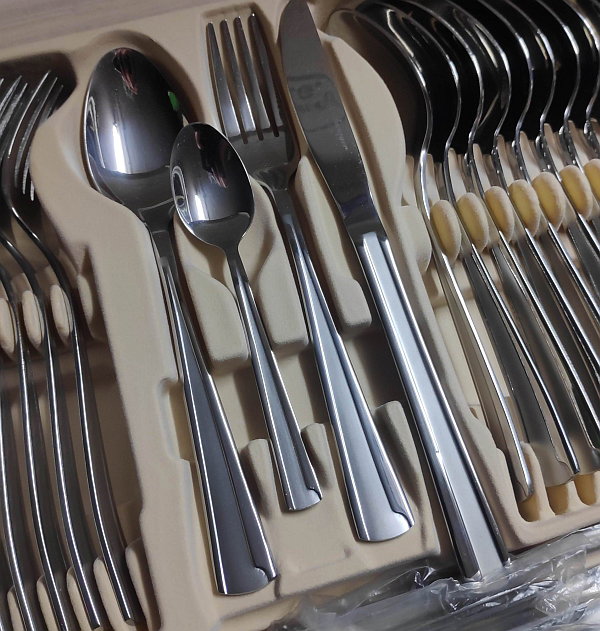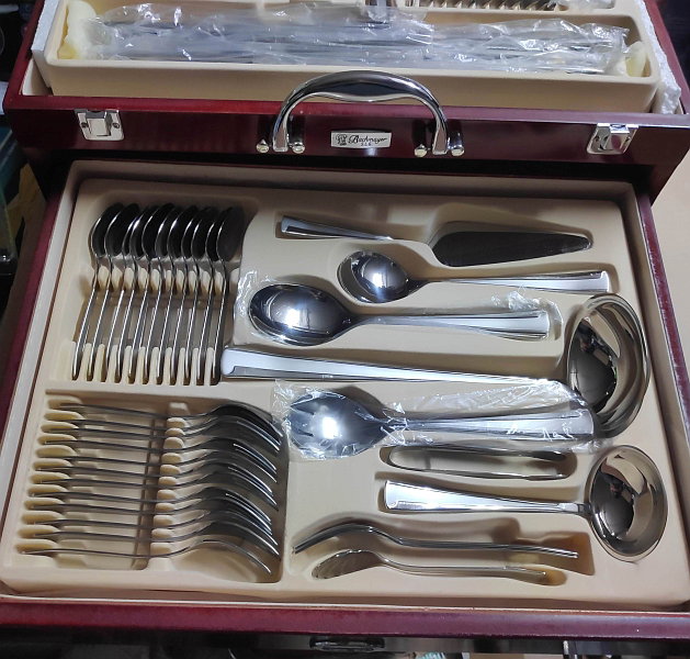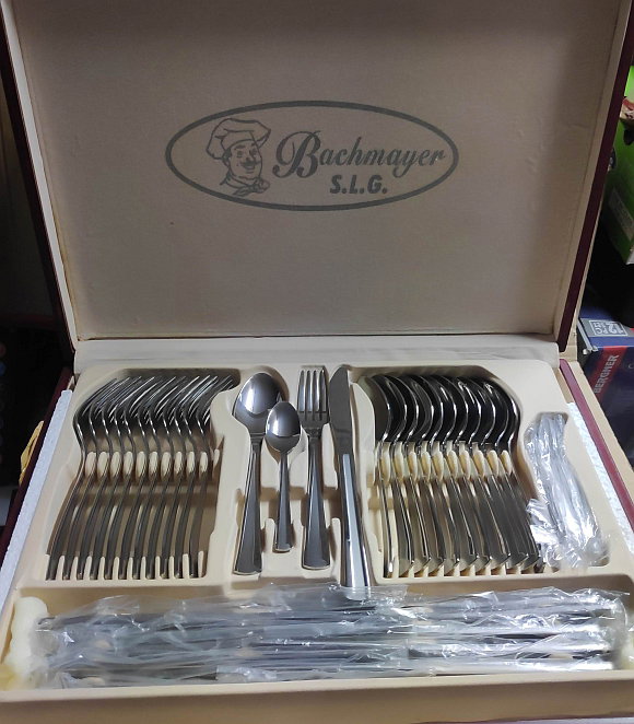 Sztućce Bachmayer w kasecie 83el. Sztućce z elementem satynowym. Komplet bez jednego noża. Stan kasety jak na zdjęciu. Sztućce nieuzywane. To są takie dłuższe i większe sztućce - długość noża ok 23cm