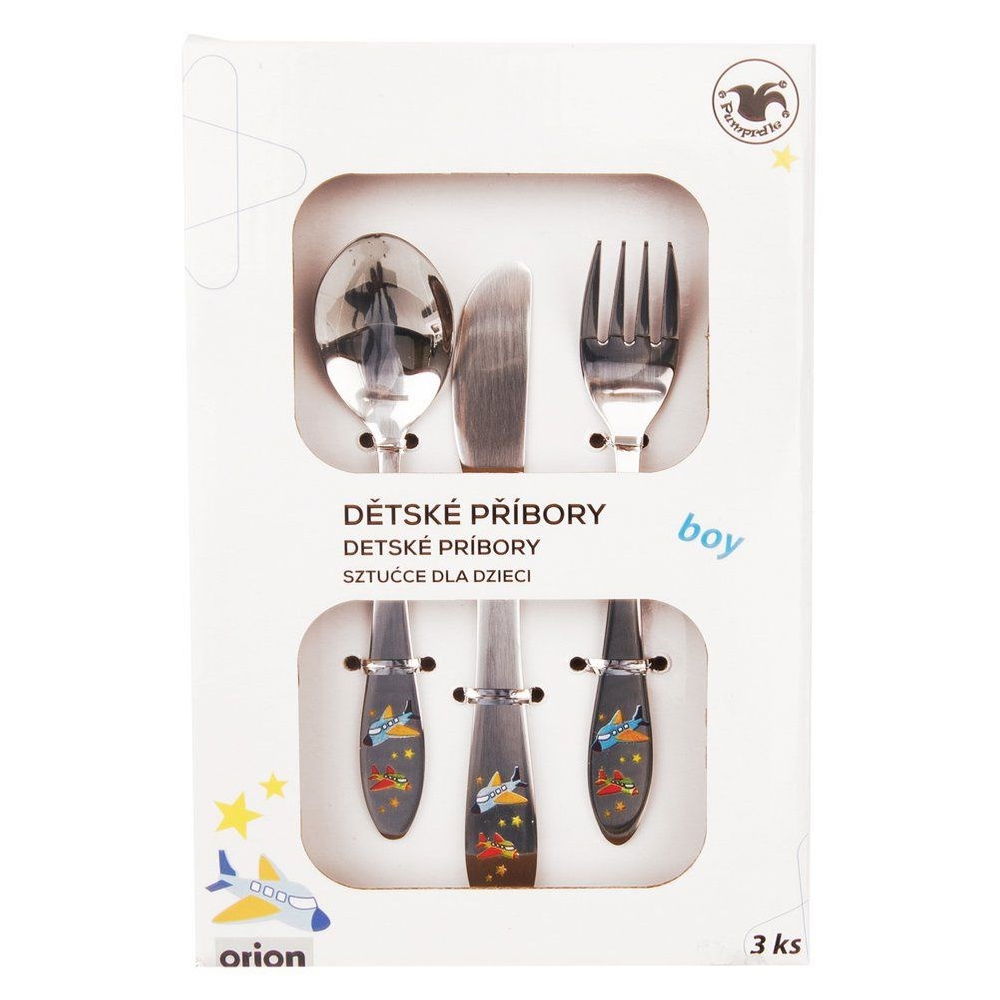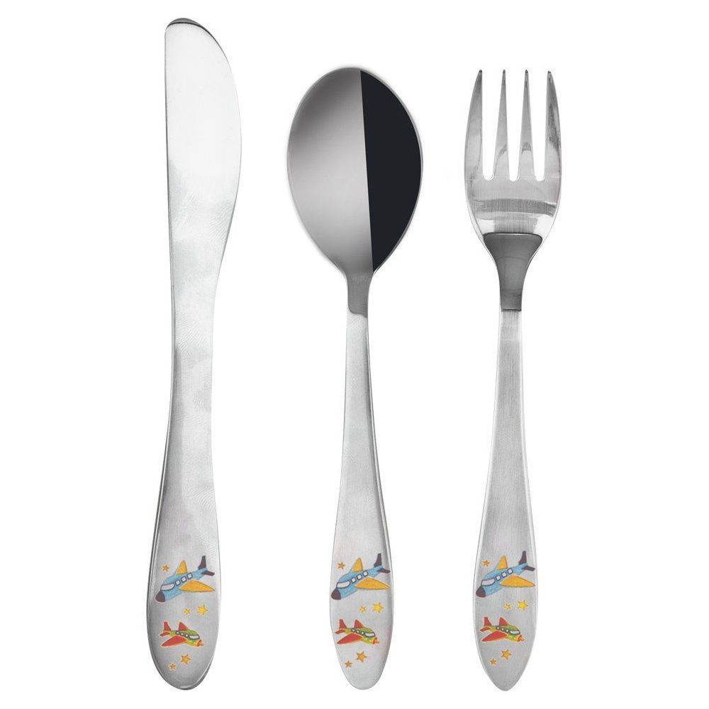 DZIECIĘCE - Zestaw sztućców dla dzieci z motywem samolotu. Służą do ćwiczenia prawidłowego spożywania posiłków. W zestawie: 1x widelec (15,5 x 2,5 cm), 1x nóż (17 x 2 cm) oraz 1x łyżka (15,5 x 3,5 cm).