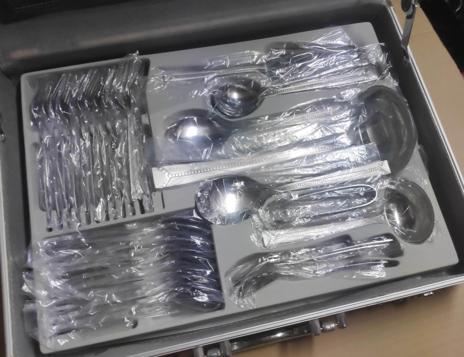 Sztućce satynowane 72 elementy w walizce (dla 12 osób). Opakowanie walizka ma zamki. W walizkach czarnych lub brązowych. 5 wzorów satynowanych. 12x nóż stołowy 12x widelec obiadowy 12x łyżka stołowa 12x widelczyk do ciast 12x łyżeczka do herbaty 2x łyżka do serwowania 2x widelec do mięsa 1x łyżka wazowa 1x łyżka do sosów 1x łyżeczka do cukru 1x szczypce do cukru 1x łopatka do tortu 1x łyżka do sałatek 1x widelec do sałatek 1x łyżka do śmietanki