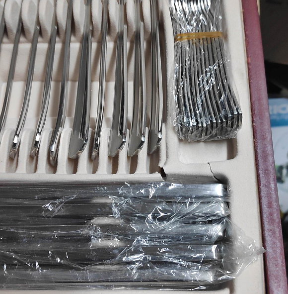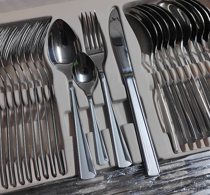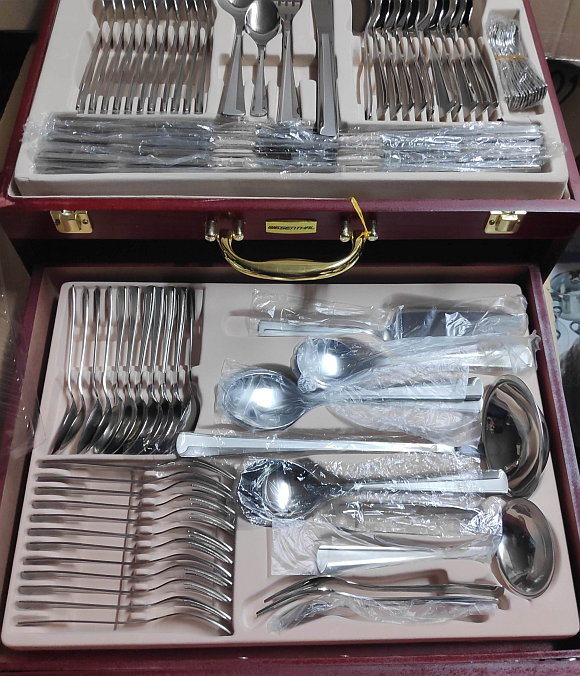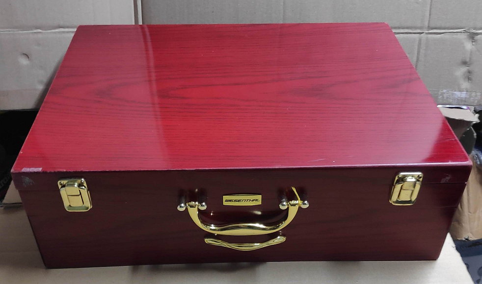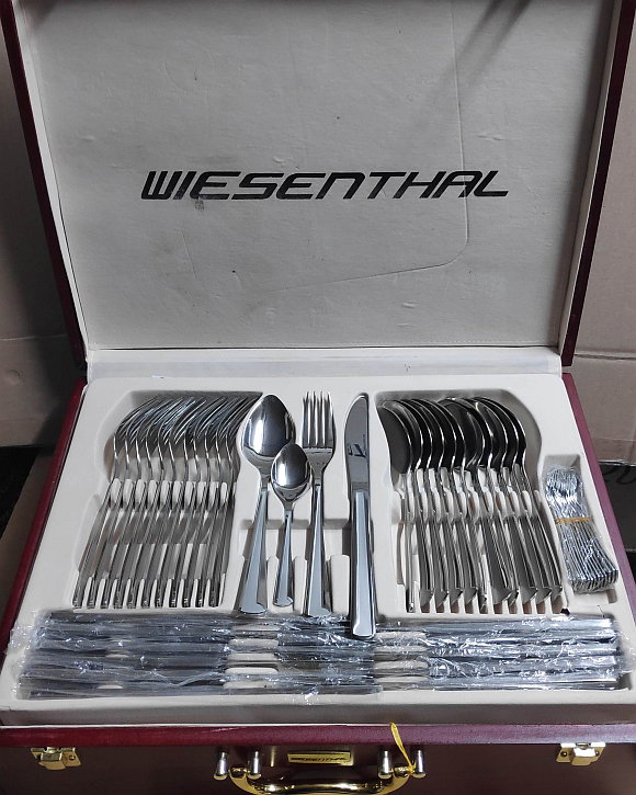 Komplet sztućców Wiesenthal 84el w satynie w kasecie drewnianej. Zestaw z takimi dłuższymi nożami i głębszymi łyżkami. Lekko pęknięta wkładka jak na ostatnim zdjęciu.