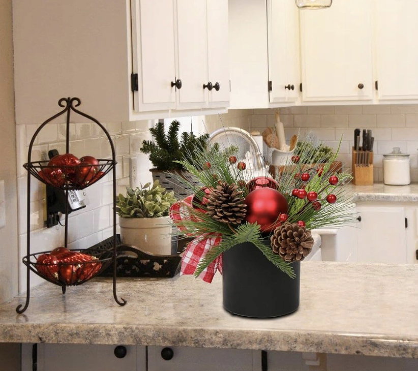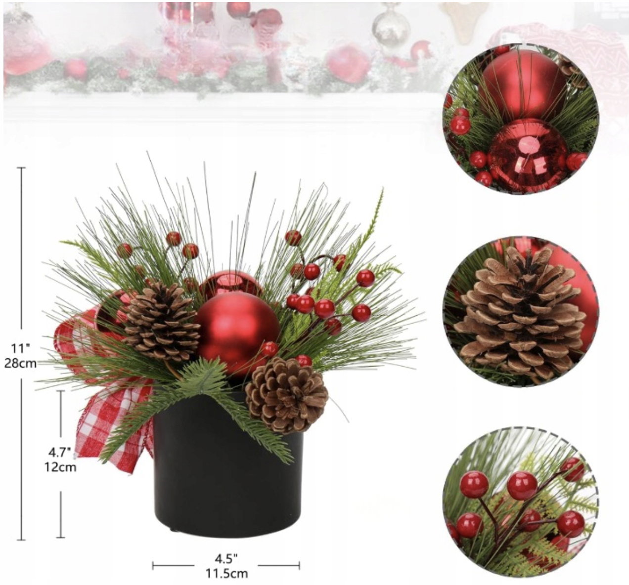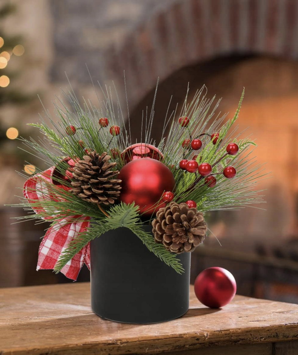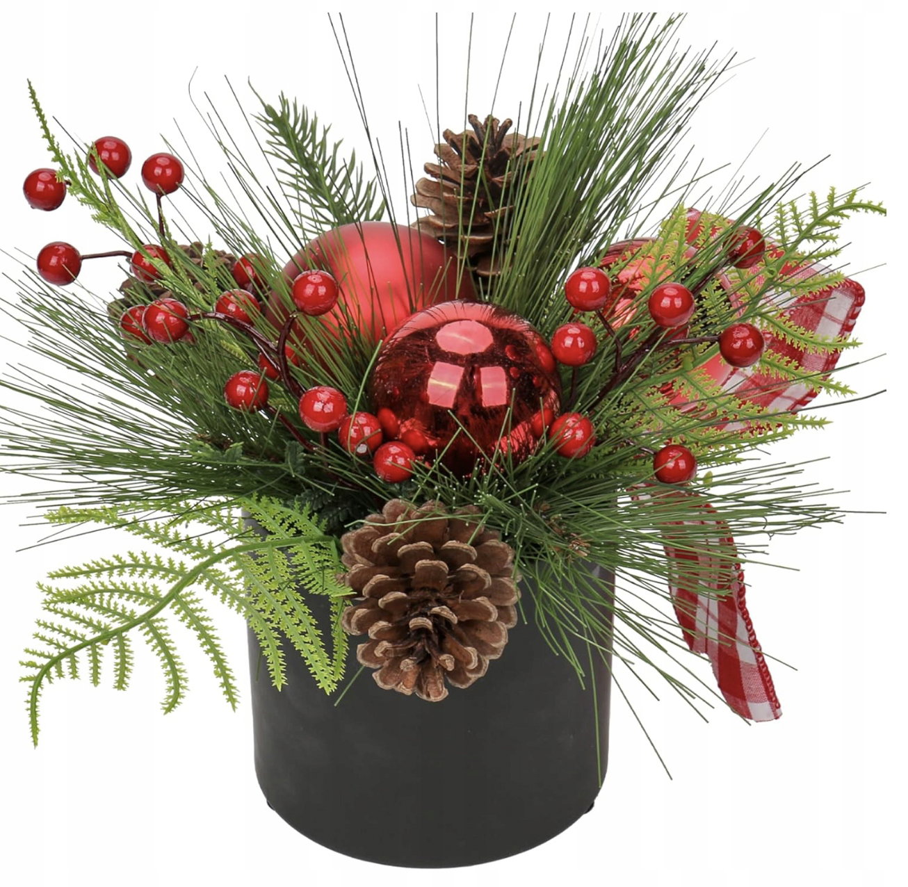 Sztuczna roślina aranżacja bożonarodzeniowa jest umieszczona w czarnej doniczce ceramicznej i można ją postawić bezpośrednio na stole, aby udekorować świąteczną atmosferę.