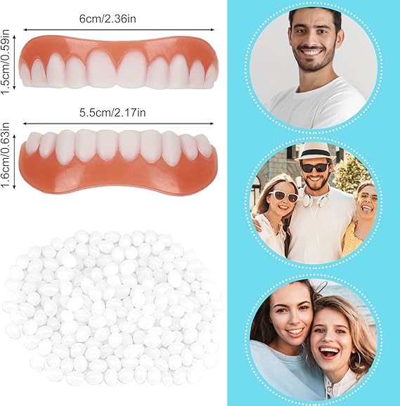 Zestaw zawiera: Otrzymasz 1 parę górnych i dolnych zębów do okleiny kosmetycznej i 10 g termicznych koralików samoprzylepnych z workiem do pakowania OPP, który nadaje się do wielokrotnego użytku, wystarczający, aby zaspokoić codzienne potrzeby.