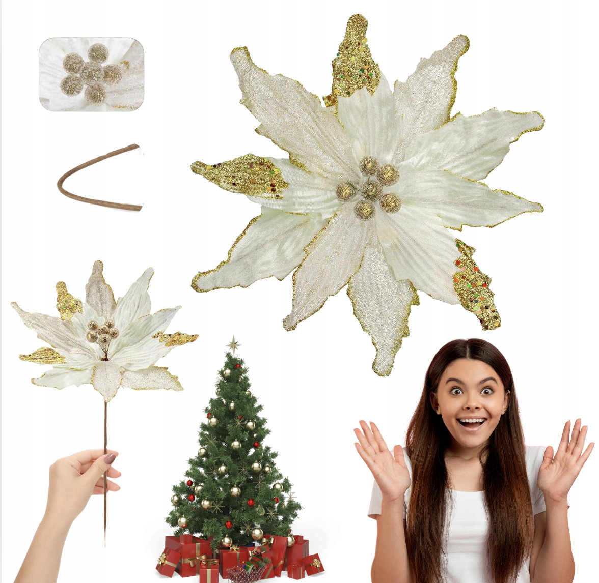 ✅ Piękny design: Sztuczne kwiaty poinsecji w intensywnych, świątecznych kolorach (czerwony, złoty, brokatowy) doskonale imitują naturalne kwiaty, wprowadzając elegancki, bożonarodzeniowy klimat.