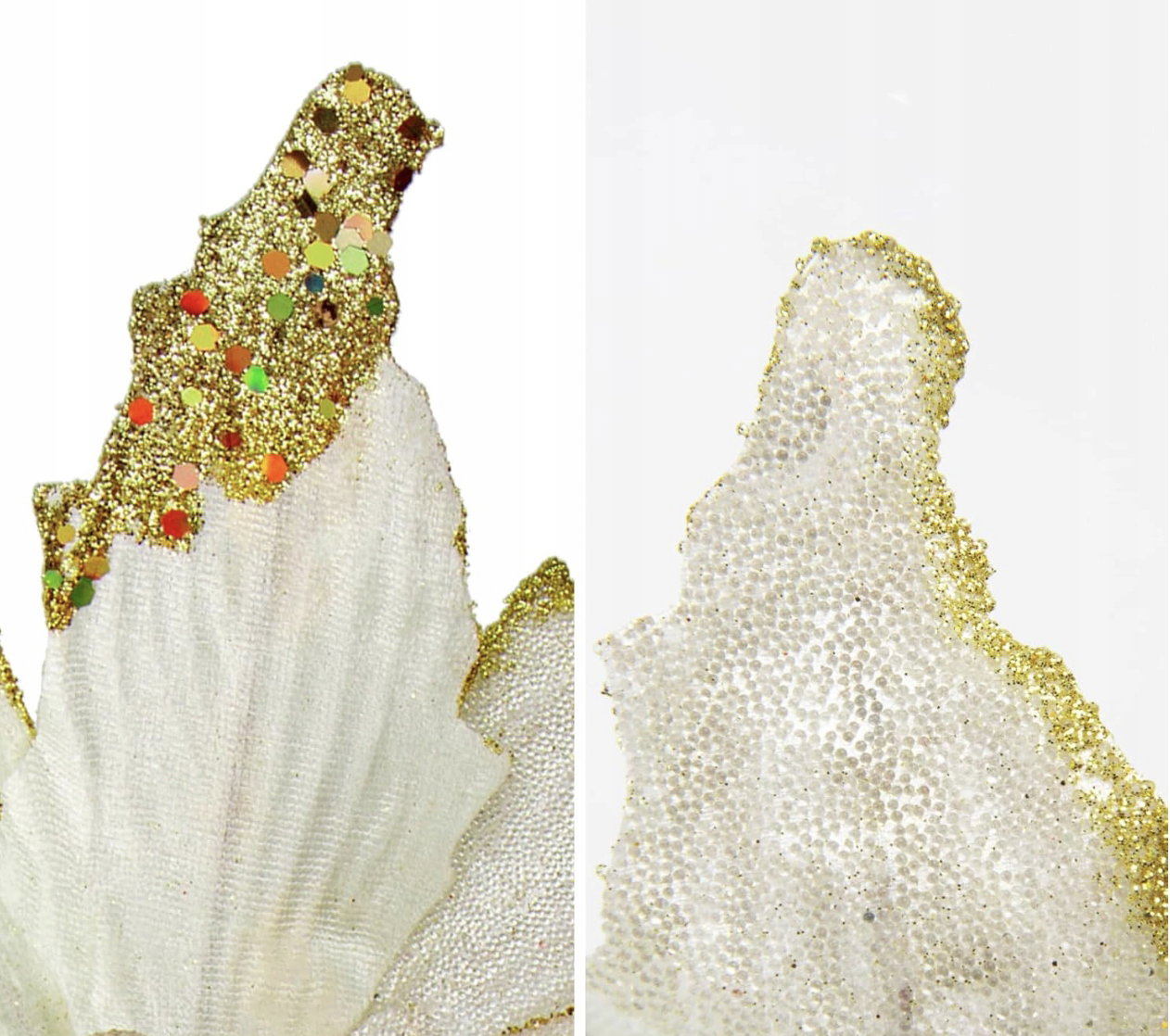 Dzięki delikatnemu brokatowi, kwiaty odbijają światło, tworząc przytulną, świąteczną atmosferę. Idealne na Boże Narodzenie i inne okazje, kiedy chcesz dodać swojej przestrzeni odrobinę świątecznej elegancji.