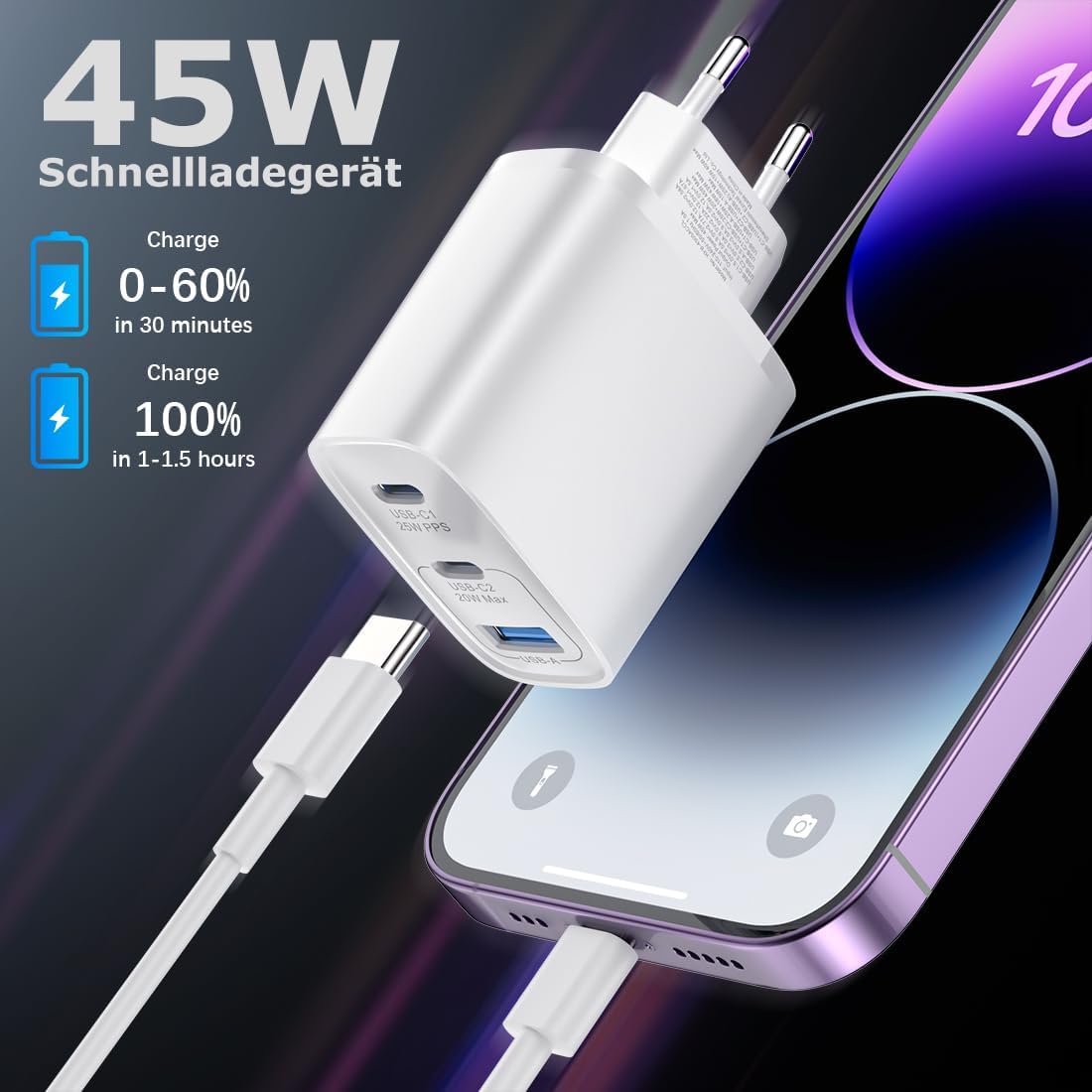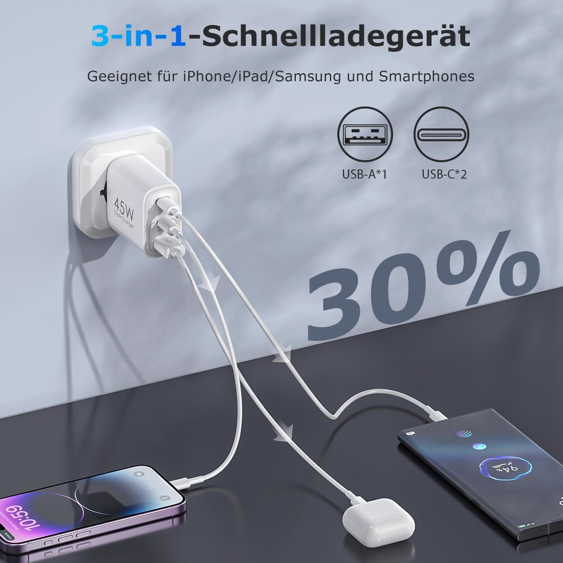 - Ładowarka USB C z 3 złączami: wydajne ładowanie czeka na Ciebie! Dzięki dwóm portom USB C i jednemu portowi USB-A ta szybka ładowarka może jednocześnie zasilać Twoje urządzenia, aby zminimalizować przestoje.