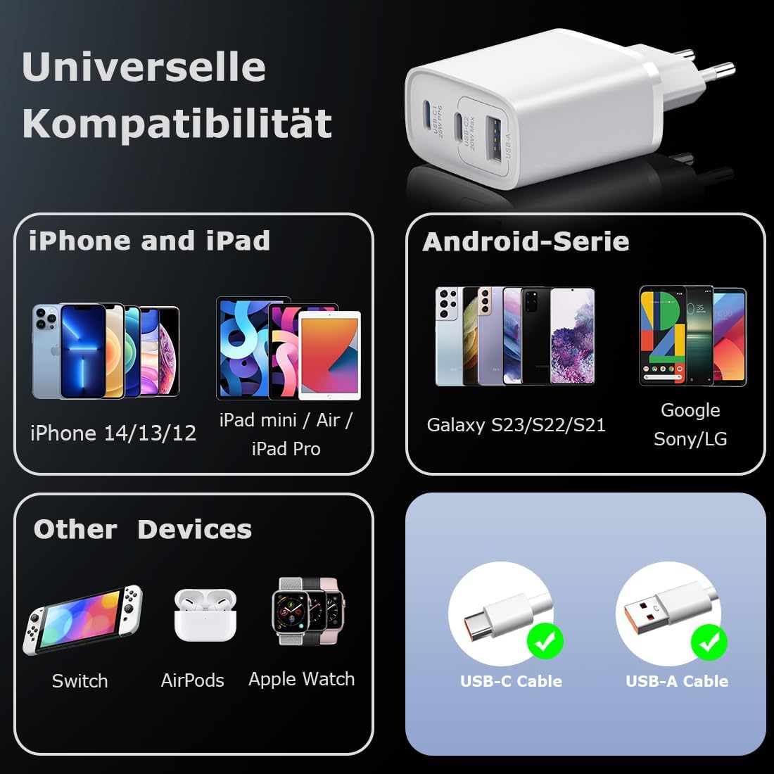 - Uniwersalna ładowarka ścienna: ten blok ładujący jest wyposażony w złącza typu C i USB-A, dzięki czemu jest kompatybilny z prawie wszystkimi urządzeniami elektronicznymi. Nadaje się do iPhone 15/15 Pro/15 Pro Max/14/14 Pro/14 Pro Max/13/13 Mini/13 Pro Max/12 Pro Max/12 Mini/SE 2020/11/11 Pro/11 Pro Max /XR/XS/X/8/7, iPad Air/Pro/Mini, Samsung Galaxy S24/S 23/S22/S21/S20/S10/S9/S8/A32/A52/A53/A71/Note 20 10. Nadaje się do laptopów, tabletów LG/Google Pixel i innych urządzeń cyfrowych.