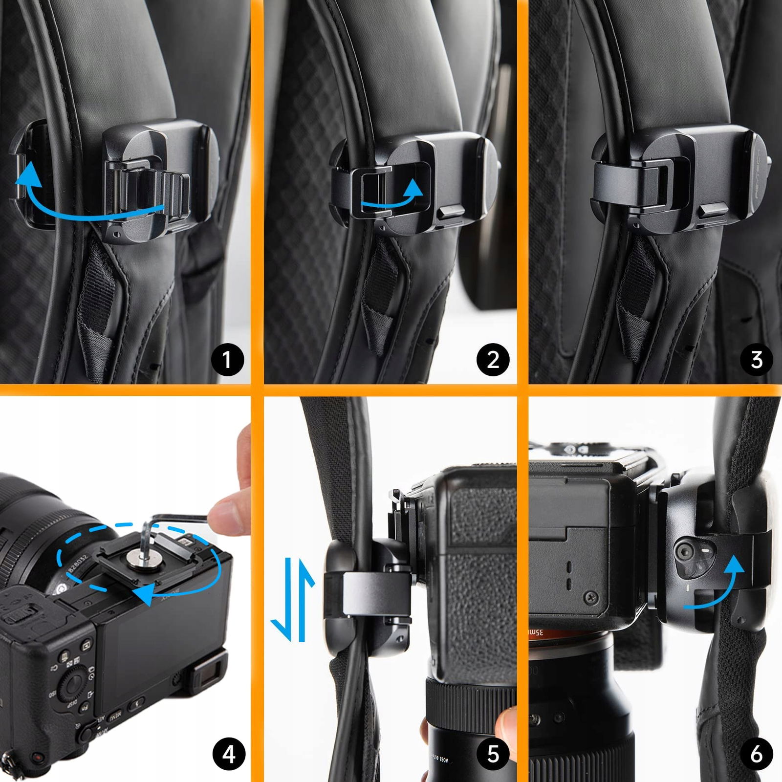 【Uwolnij ręce, korzystaj z aparatu w mgnieniu oka】 Przymocuj aparat do zatrzasków, aby uwolnić ręce i cieszyć się podróżą. Klips do aparatu Beetle umożliwia szybkie zamontowanie i zablokowanie aparatu bez konieczności naciskania jakichkolwiek przycisków.