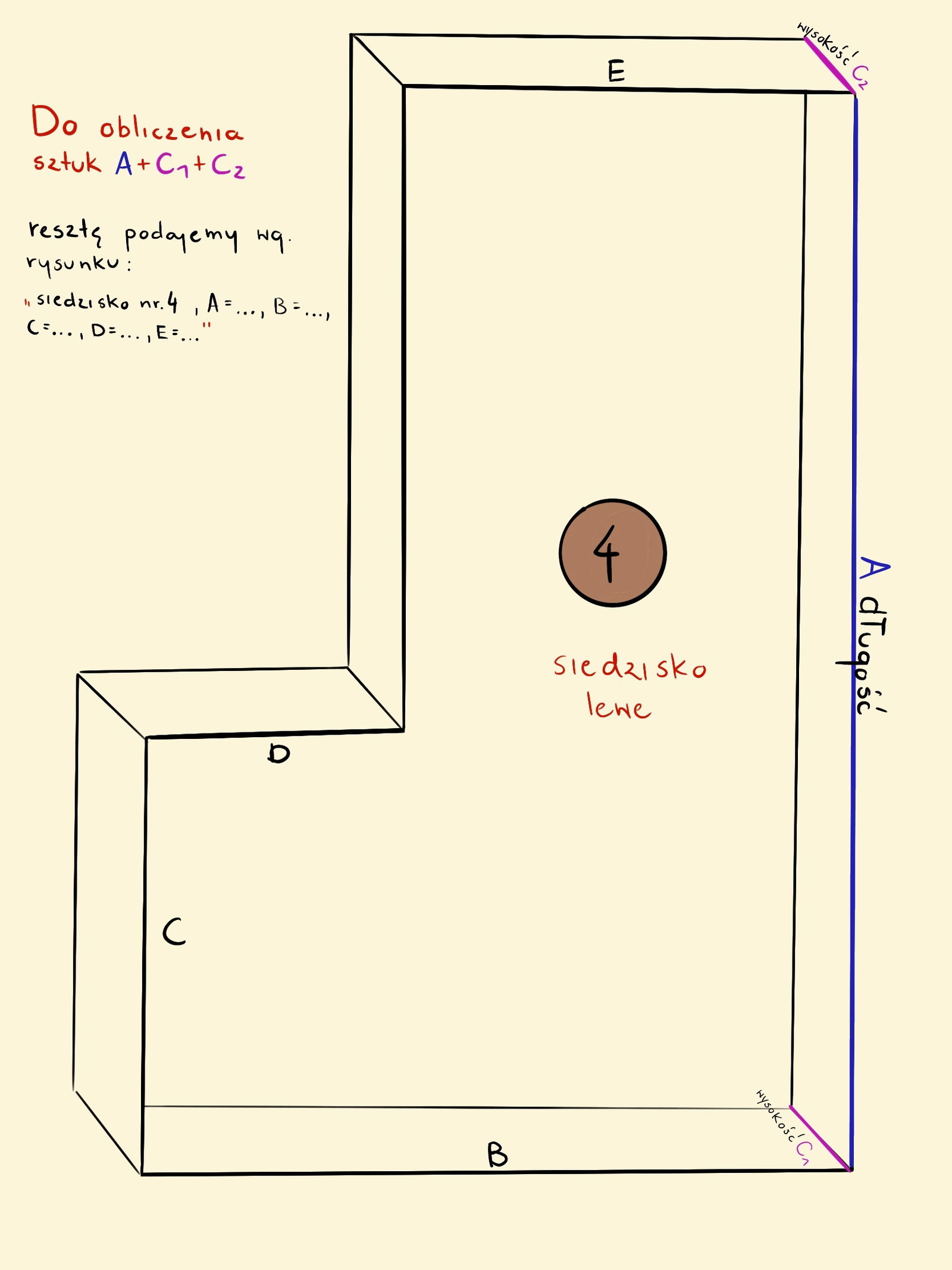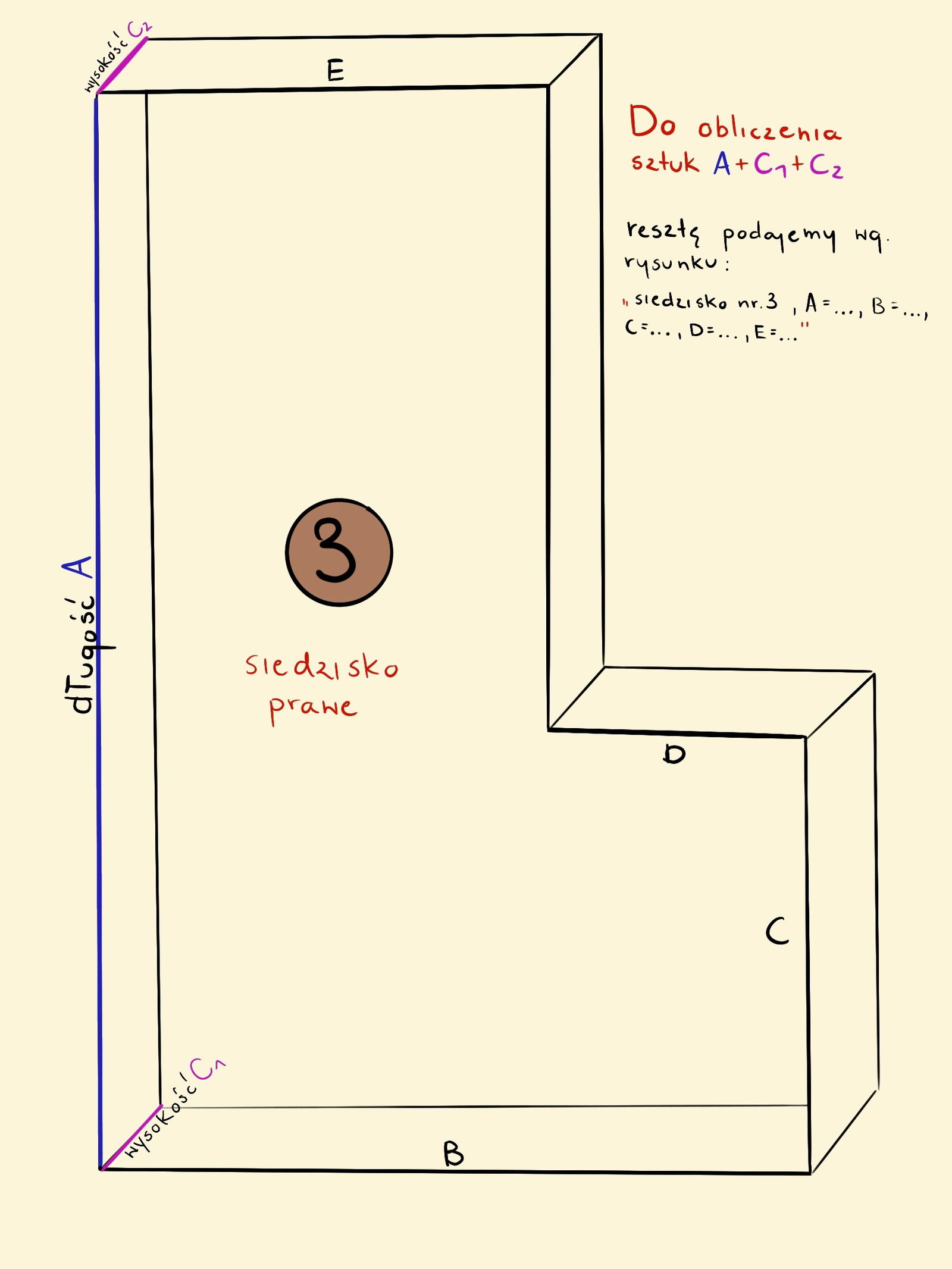 Przykład: płaszczyzna jednego siedziska to wymiary 78cm szerokość ,135cm długość i10cm grubość boków . Liczymy więc : (A)135 + (C1)10 + (C2)10 czyli 155 cm długości do wyceny .
