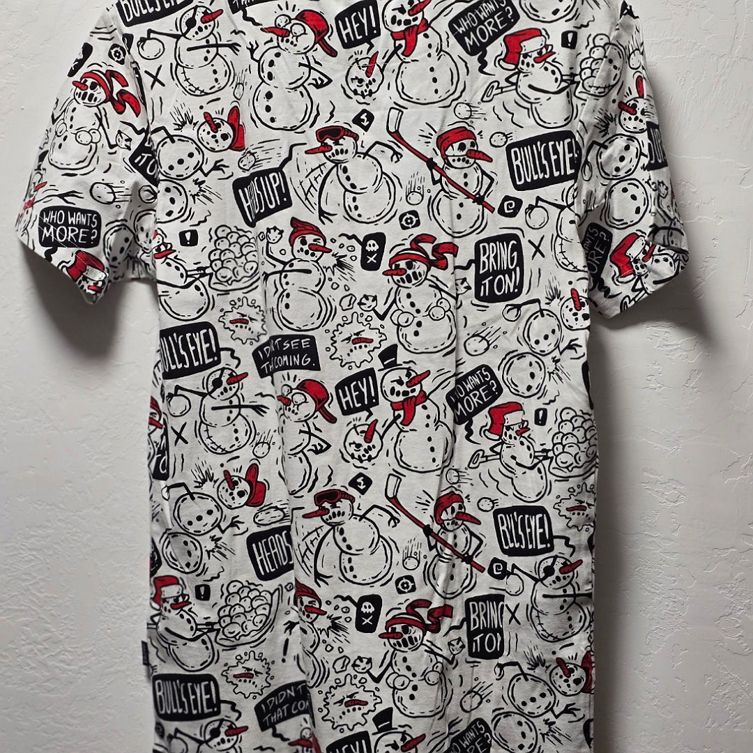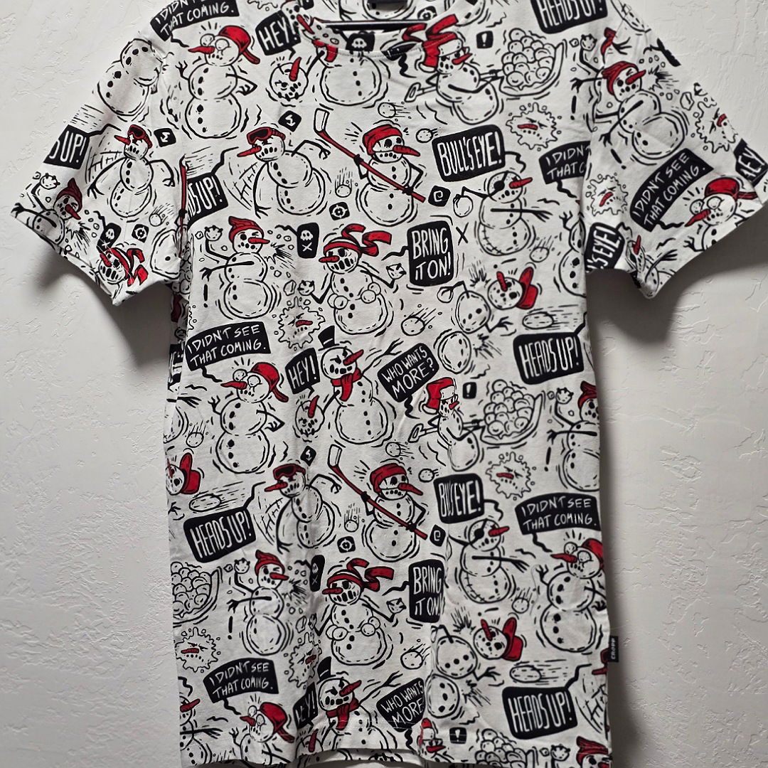 Na sprzedaż wyjątkowa koszulka marki CROPP, idealna na zimowy sezon! Wyróżnia się oryginalnym designem przedstawiającym zabawne bałwanki oraz humorystyczne napisy takie jak "Heads up!", "Bullseye!", "Bring it on!" czy "I didn’t see that coming." Grafika utrzymana jest w kolorystyce bieli, czerni i czerwieni, co nadaje jej wyrazistego charakteru.