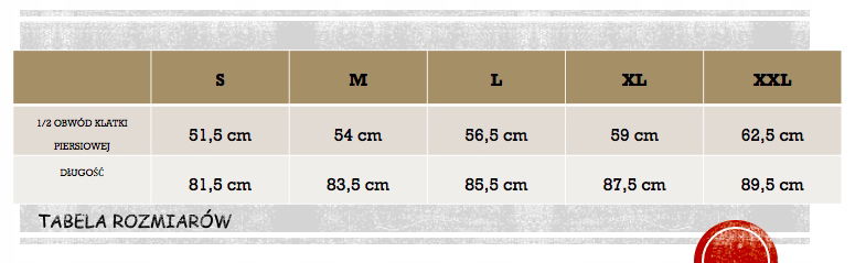 Przed zakupem sugerujemy zweryfikować tabelę rozmiarów