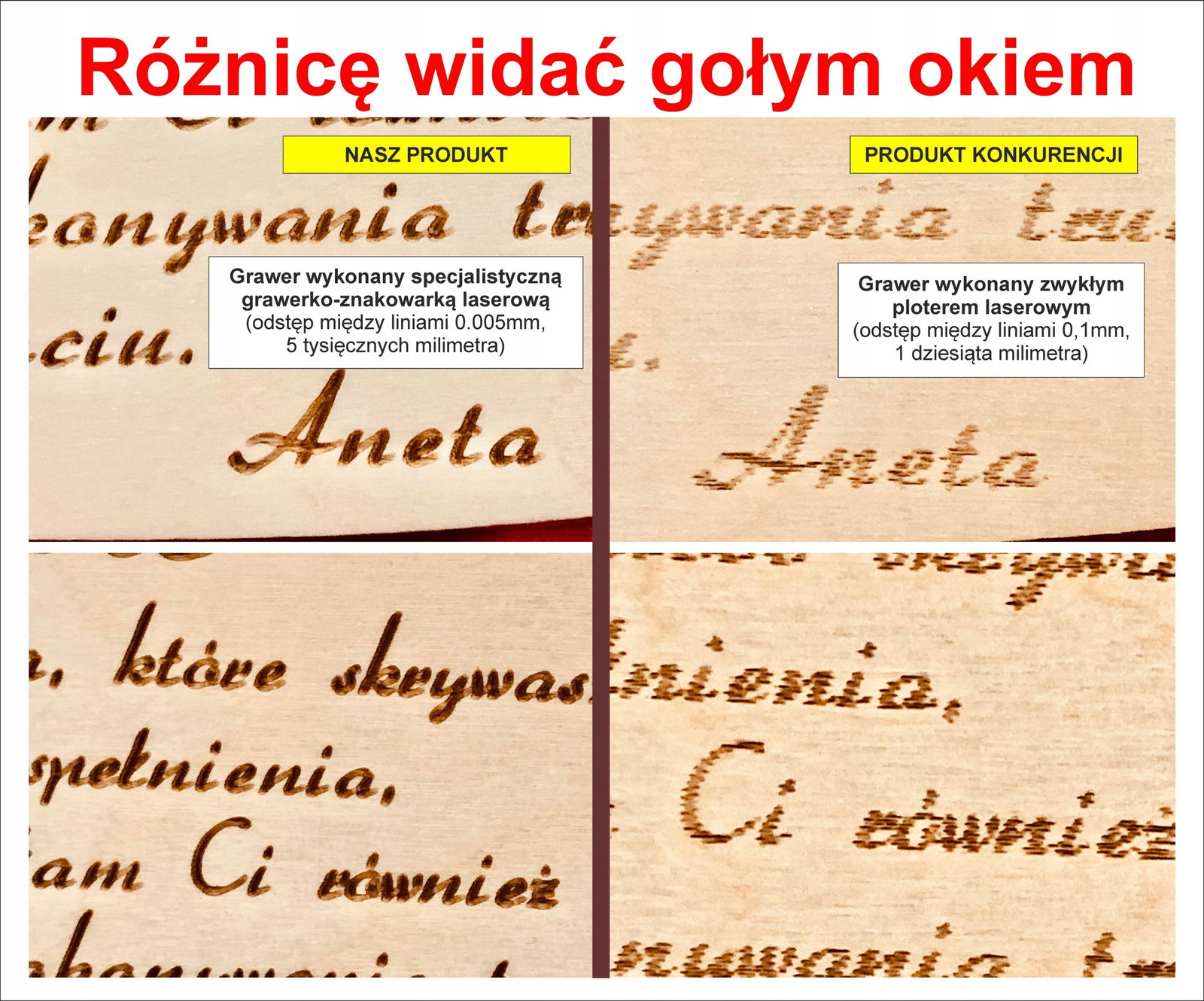 Różnicę między naszym produktem a produktami konkurencji przedstawimy na poniższej fotografii, na której widać dość wyraźną różnicę w jakości grawerunku jaka występuje podczas grawerowania ploterem laserowym a specjalistyczną znakowarką w której skok ścieżki promienia lasera w przypadku grawerowania sklejki ustawiamy na 0,01mm a ploterem laserowym CO2 w którym standardowy skok wynosi 0,2mm, co daje 20 razy większą dokładność odwzorowania i wyraziste kolory.