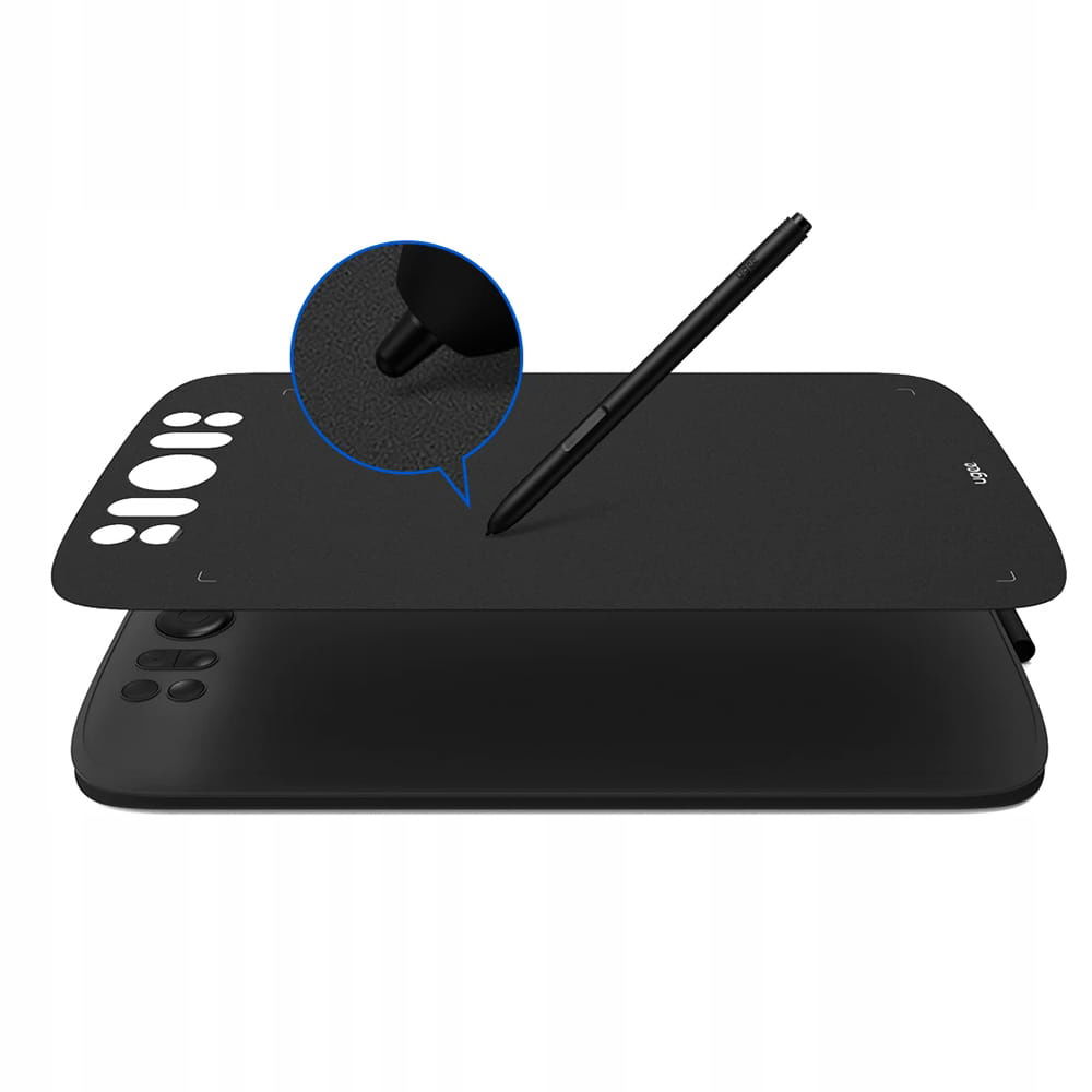 Dołączony do zestawu rysik posiada dwa konfigurowalne przyciski funkcyjne. System wbudowanych czujników niwelujących niepożądane efekty związane z drganiami i odbiciem końcówki zapewnia doskonałą stabilizację, a także umożliwia rozpoznanie kąta nachylenia rysika do 60°. Na obudowie tabletu umieszczono materiałowy uchwyt na piórko. W komplecie znajdziemy 10 dodatkowych wymiennych końcówek.